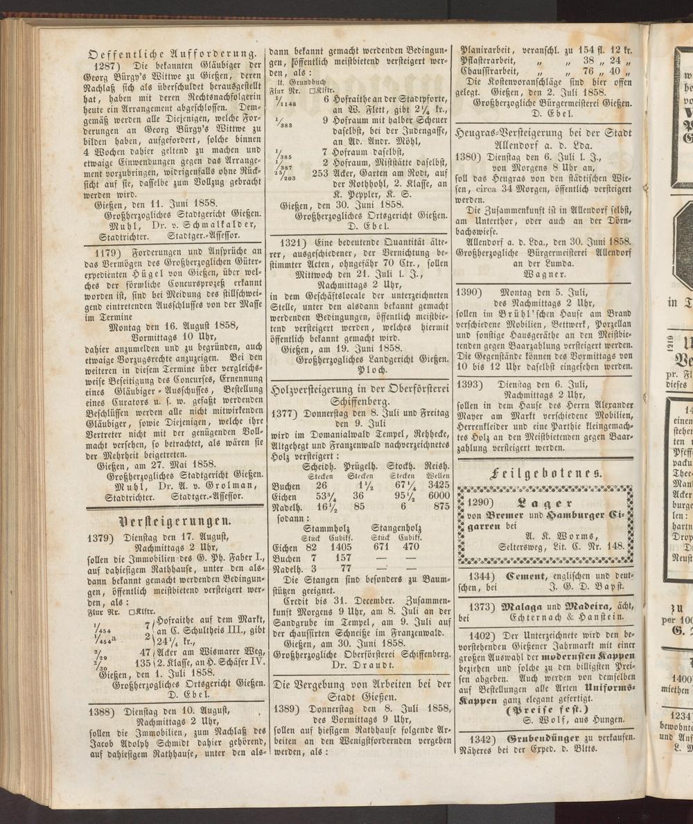 Gießen, den 30. Juni 1858. Großherzogliches Ortsgericht Gießen.