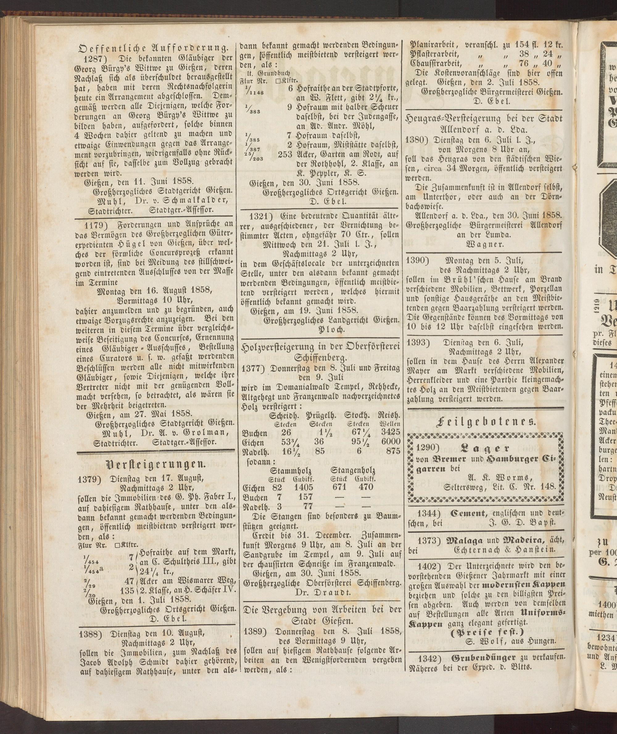 Gießen, am 30. Juni 1858. Großherzogliche Oberförsterei Schiffenberg.