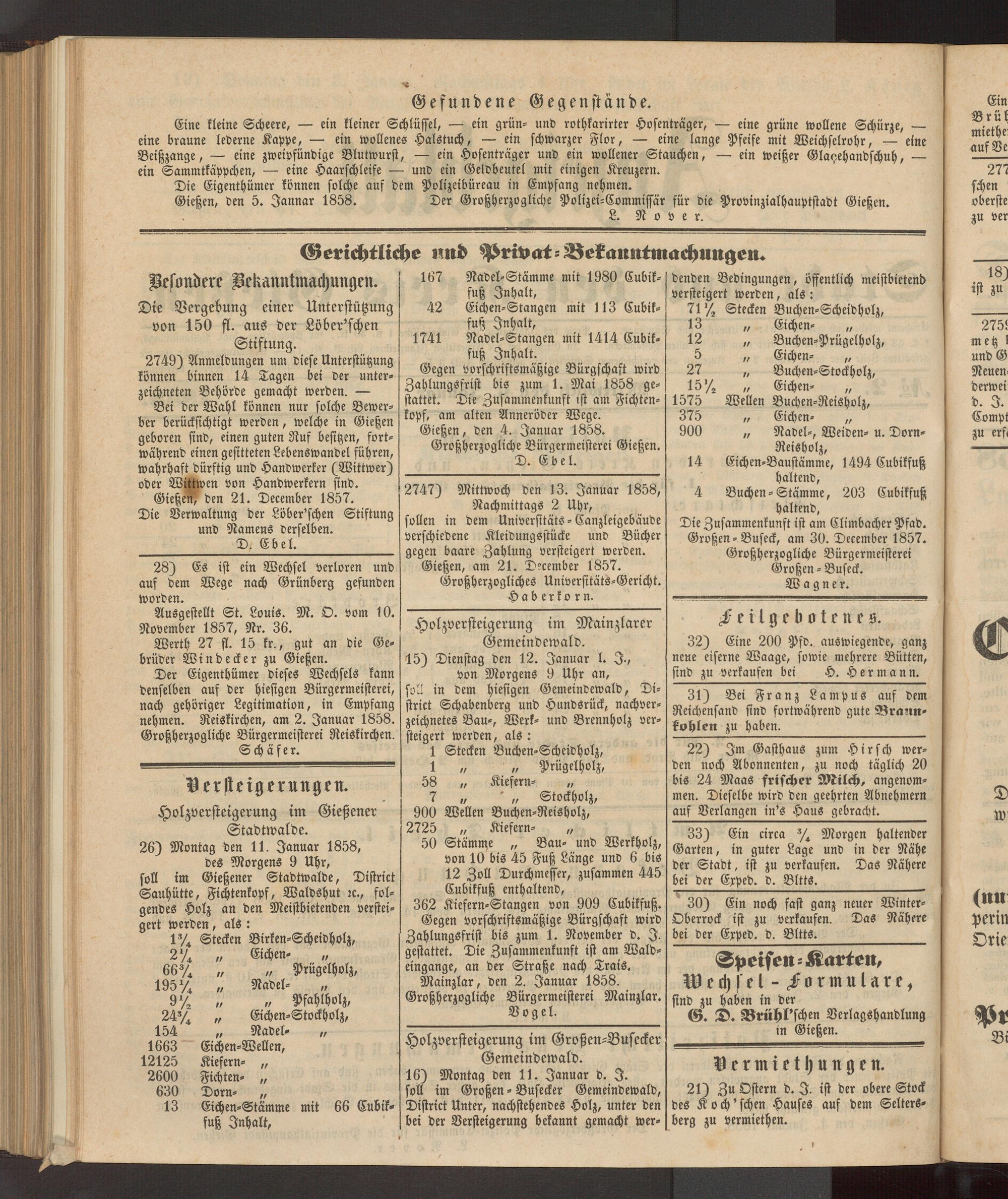 Gießen, den 5. Jannar 1858. Der Großherzogliche Polizei-Commissär für die Provinzialhauptstadt Gießen.