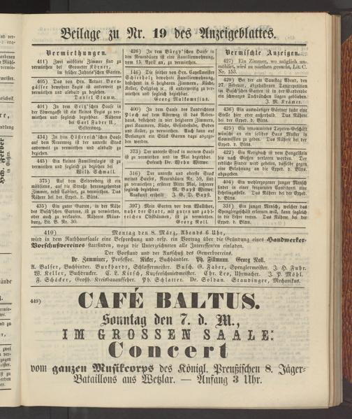 vom ganzen Musikcorps des Königl. Preußischen 8. Jäaer- Batalllons aus Wetzlar. — Anfang 3 Uhr.