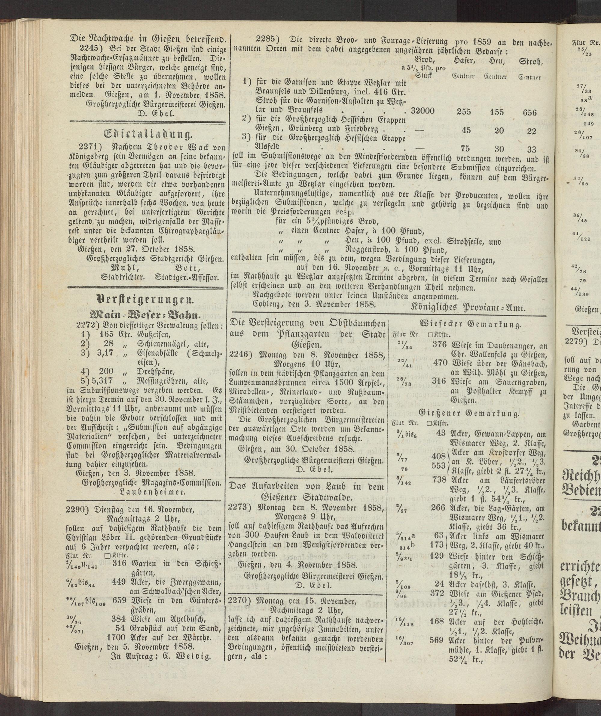 2245) Bei der Stadt Gießen sind einige Nachtwache-Ersatzmänner zu bestellen. Diejenigen diesigen Bürger, welche geneigt sind, eine solche Stelle zu übernehmen, wollen dieses bei der unterzeichneten Behörde anmelden. Gießen, am 1. November 1858.