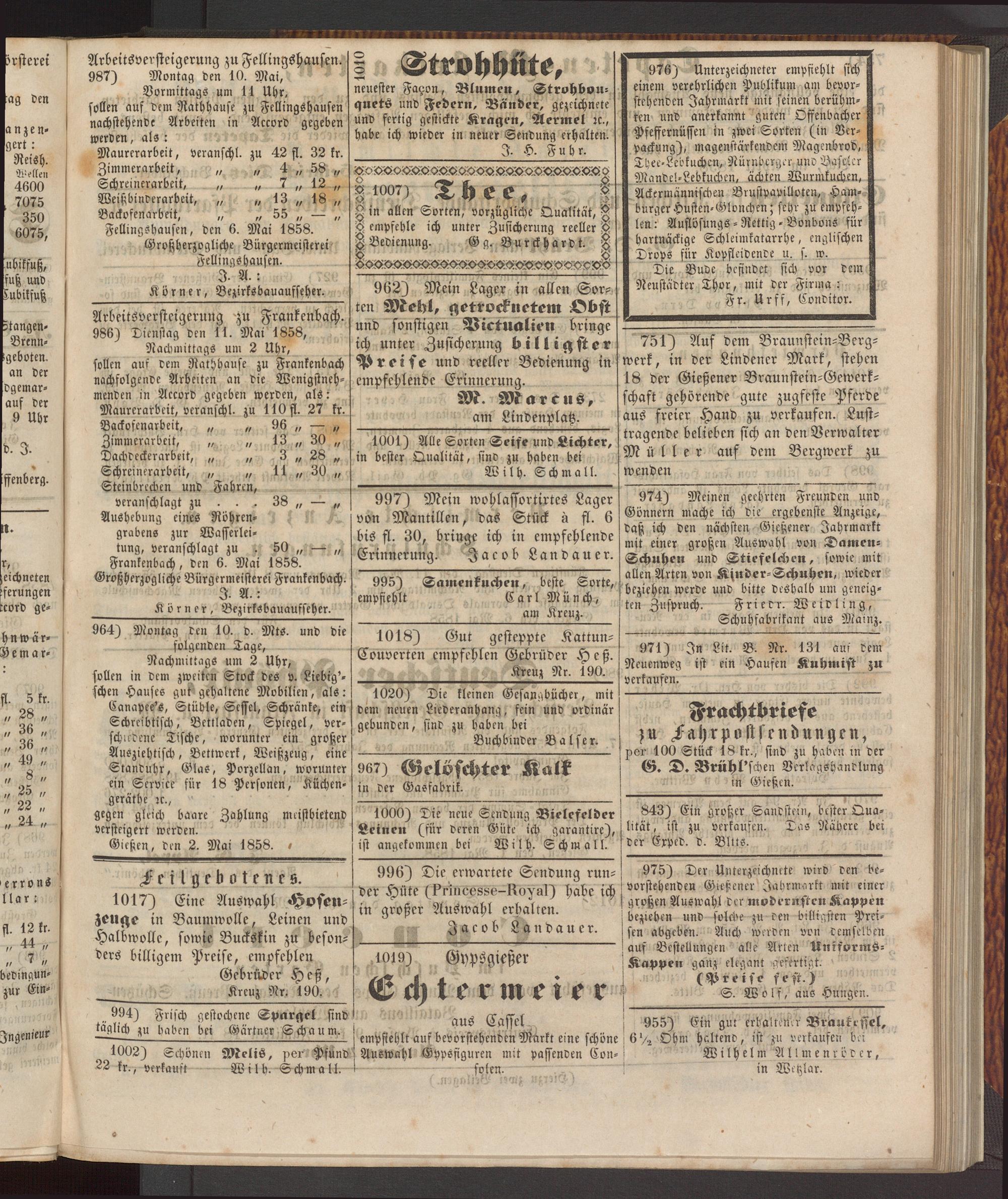 974) Meinen geehrten Freunden und Gönnern mache ich die ergebenste Anzeige, daß ich den nächsten Gießener Jahrmarkt mit einer großen Auswahl von Damen- Schnhen und Stiefelehen, sowie mit allen Arten von Ksnder-Schnhen, wieder beziehen werde und bitte deshalb uni geneigten Zuspruch. Frierr. Weidling, Schuhfadrikant aus Mainz.
