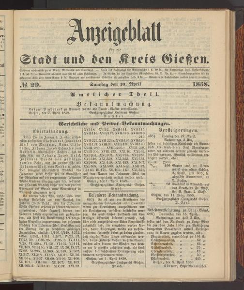 Gießen, den 11. März 1858. Großherzogliches Ortsgericht Gießen. D. Ebel.