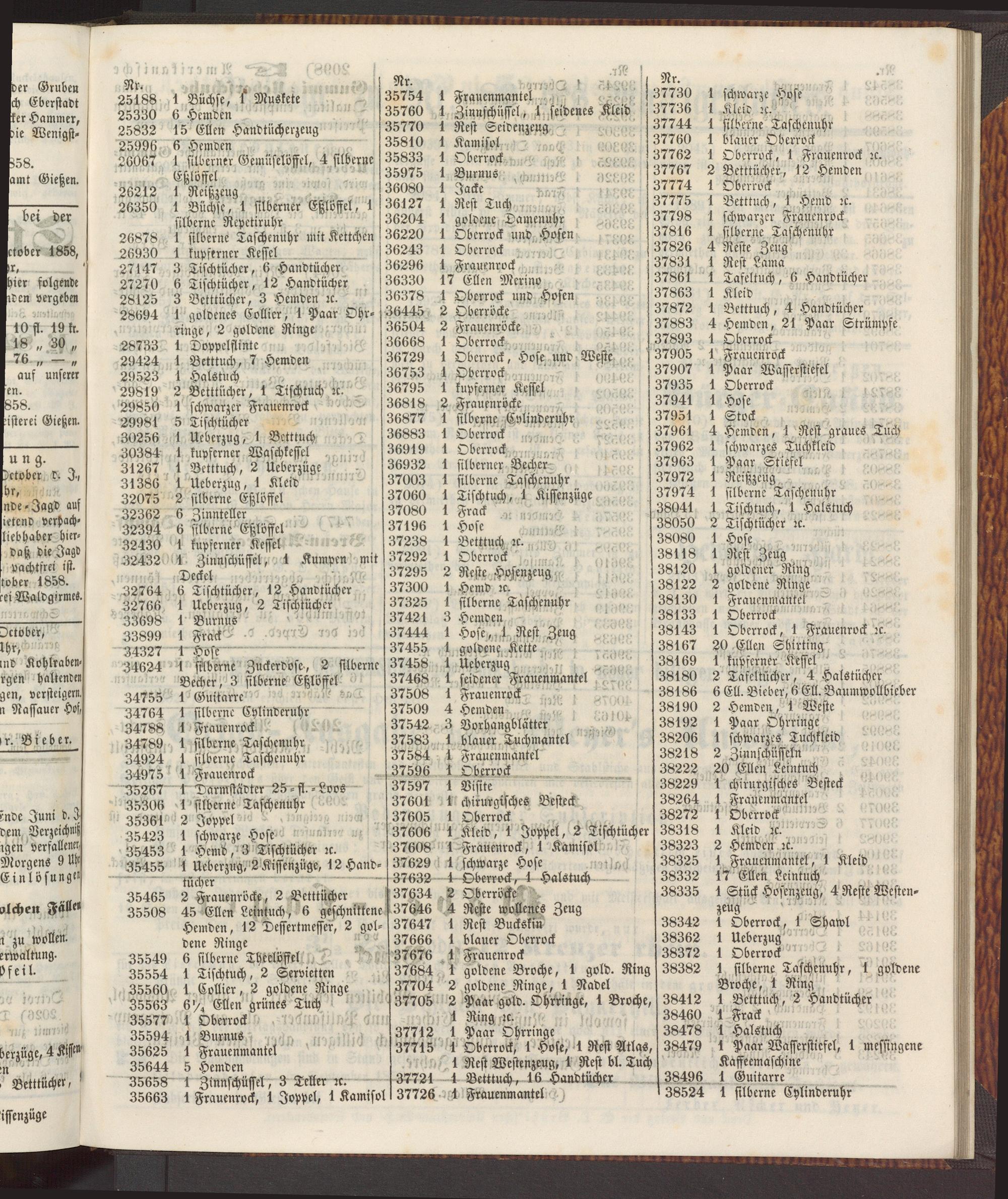 36753 1 Oberrock 36795 1 kupferner Kessel 36818 2 Frauenröcke 36877 1 silberne Cnlinderuhr 36883 1 Oberrock 36919 1 Oberrvck 36932 1 silberner Becher 37003 1 silberne Taschenuhr 37060 1 Tischtuch, 1 Kissenzüge 37080 1 Frack 37196 1 Hose 37238 1 Betttuch rc.