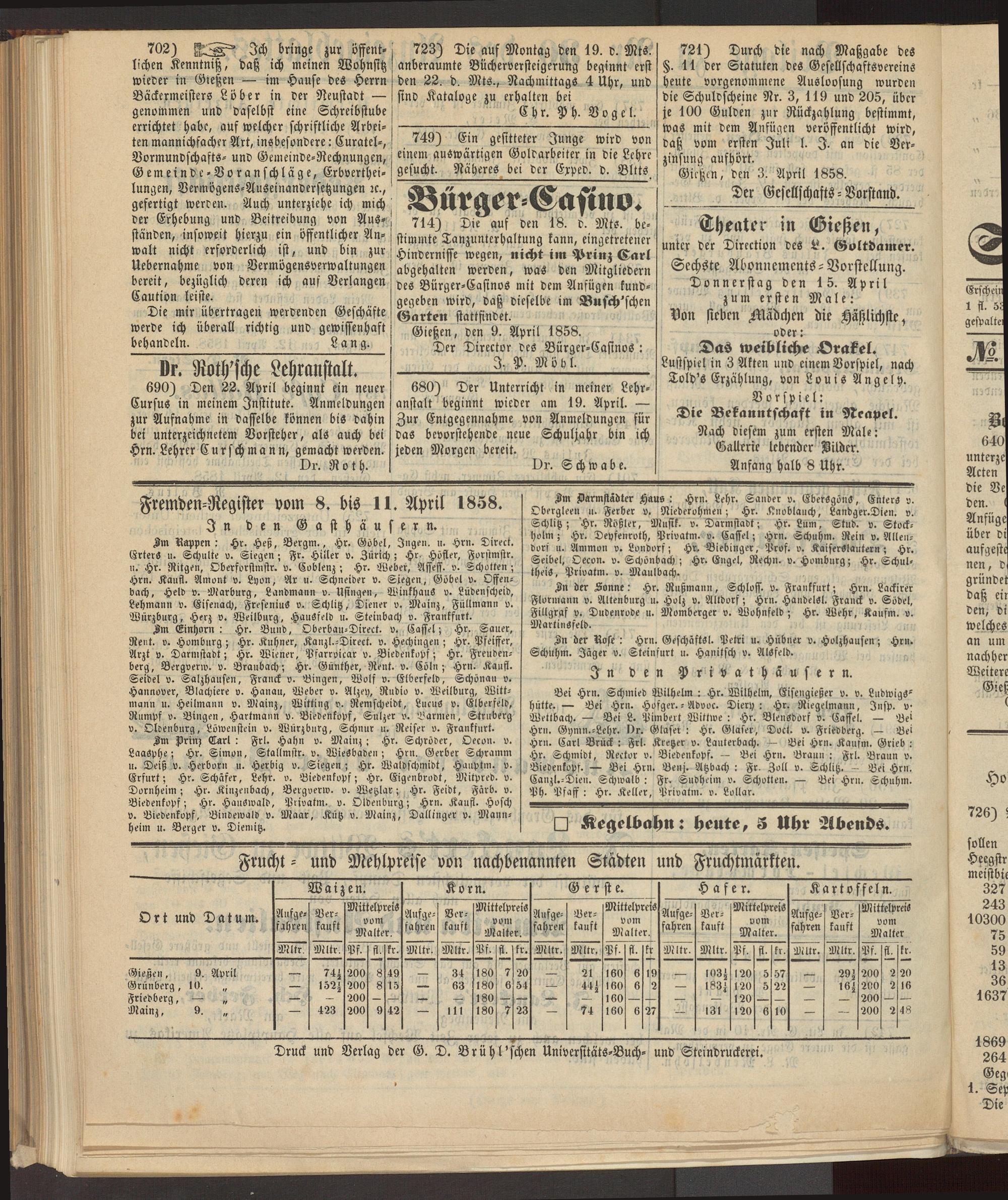 Im Darmstädter Haus: Hrn. Lehr. Sander v. Ebersgöns, Enters v. Obergleeu ». Ferber v. Niederohmen; Hr. Knoblauch, Landger.Dien. v. Schlitz; 'Hr. Rößler, Musik, v. Darmstadt; Hr. Lum, Stud. v. Stockholm; Hr. Depfenroth, Privatm. v. Caffel; Hrn. Schuhm. Rein v. Allen- dori u. Ammon v. Londorf; Hr, Biebinger, Prof. v. Kaiserslautern; Hr. Seibel, Oecon. v. Schönbach; Hr. Engel, Rechn, v. Homburg; Hr. Schultheis, Privatm. v. Maulbach.