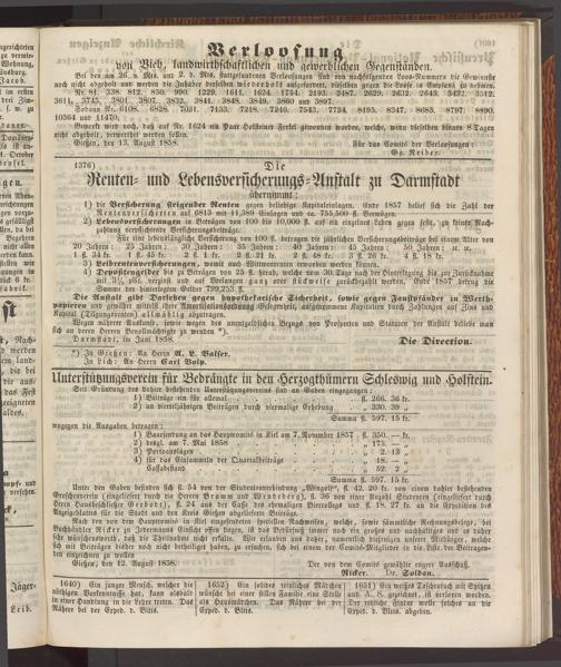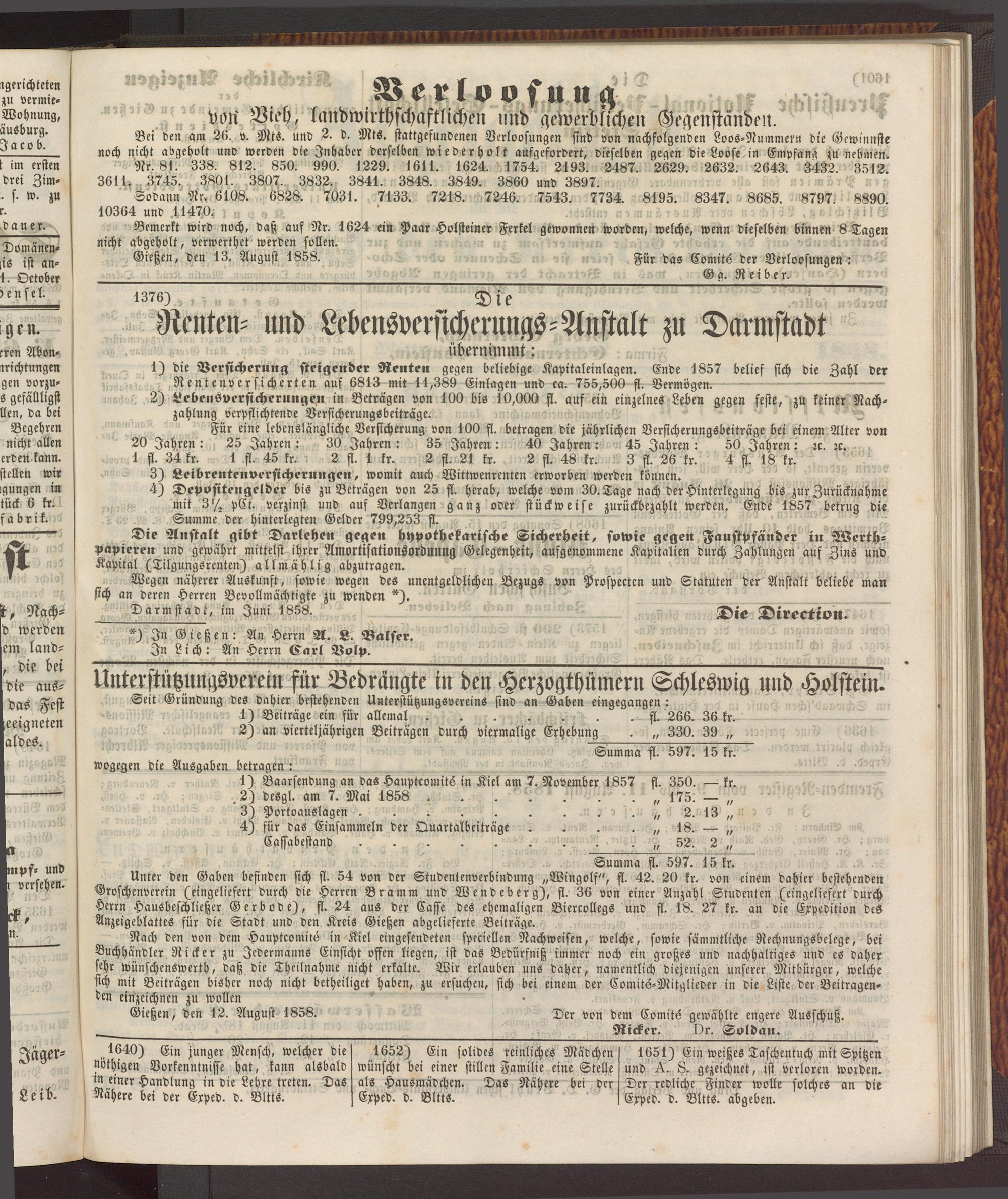 Gießen, den 13. August 1858. Für das Comit6 der Verloosungen: