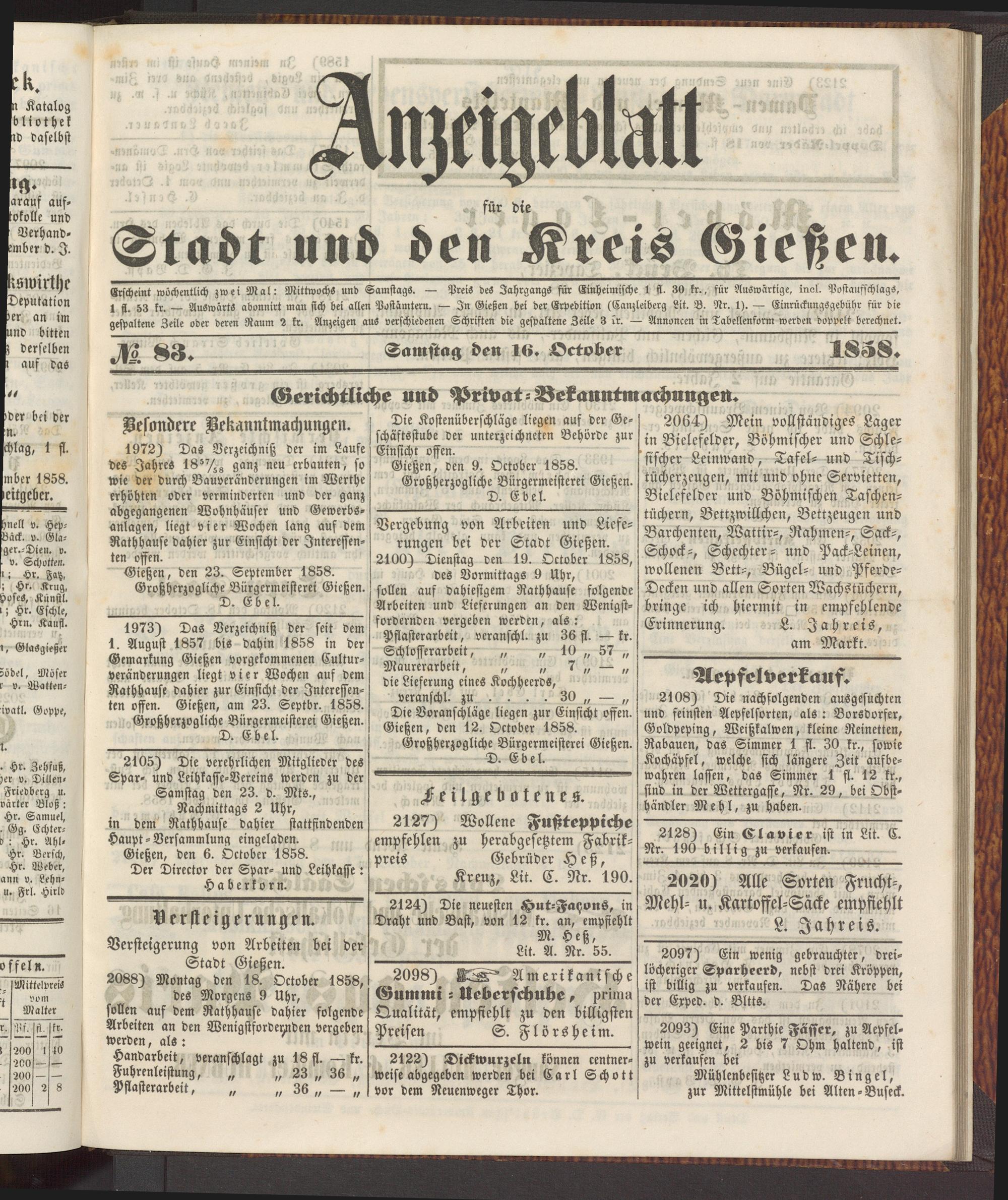 Erscheint wöchentlich zwei Mal: Mittwochs und Samstags. — Preis des Jahrgangs für Einheimische 1 fl. 30 ft., für Auswärtige, incl. Postaufschlags, 1 ff. 53 kr. — Auswärts abonnirt man stch bei allen Postämtern. — In Gießen bei der Erpedition (Canzleiberg Lit. B. Nr. 1). — Einrückungsgebühr für die gespaltene Zeile oder deren Raum 2 kr. Anzeigen aus verschiedenen Schriften die gespaltene Zeile 3 kr. — Annoncen in Tabellenform werden doppelt berechnet.