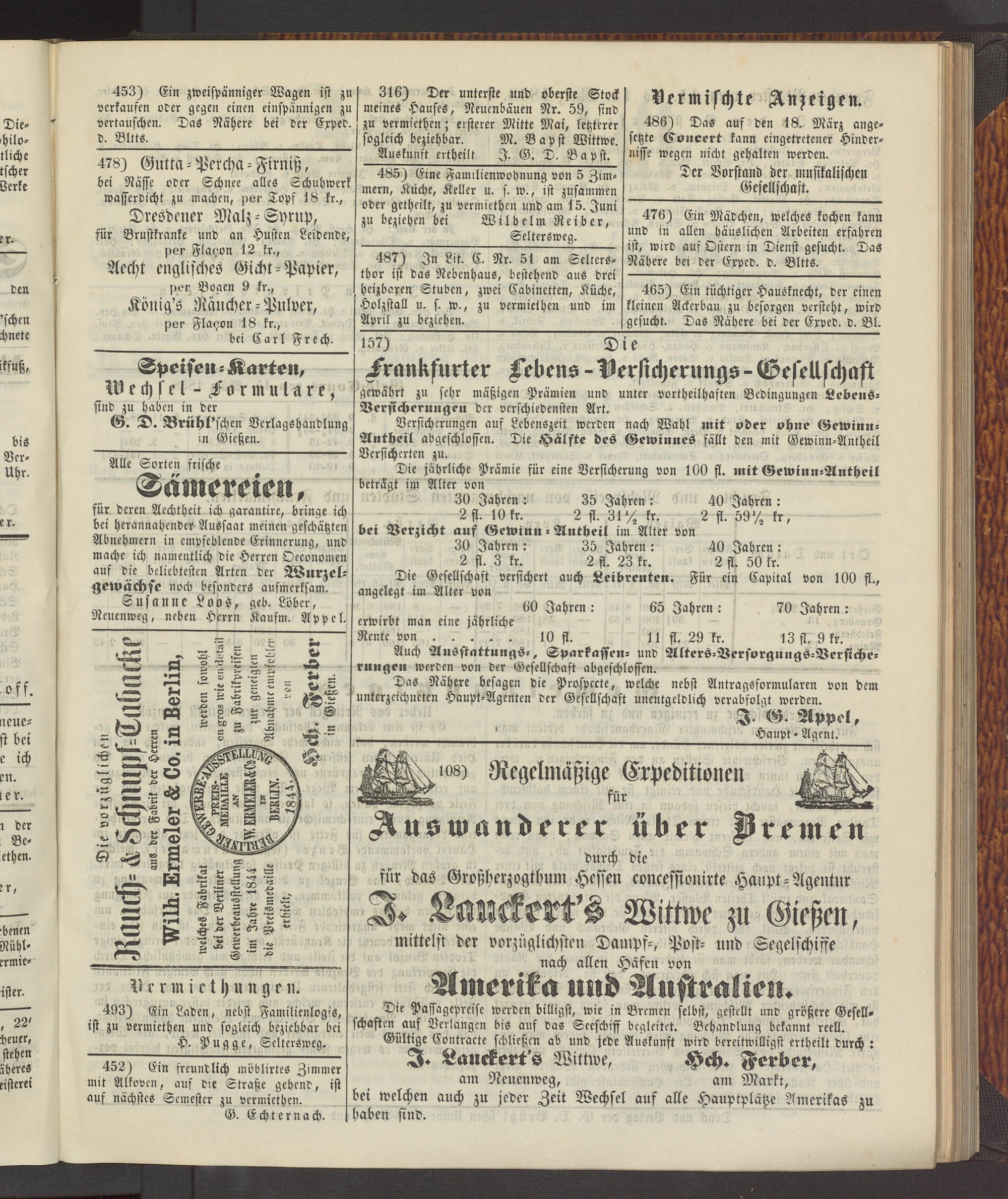 Auswanderer über Dremen durch die für das Großherzogthum Hessen concessionirte Haupt-Agentur 3» DWßMWM Wittwe zu Gießen, mittelst der vorzüglichsten Dampf-, Post- und Segelschiffe nach allen Häfen von Amerika und Australien.