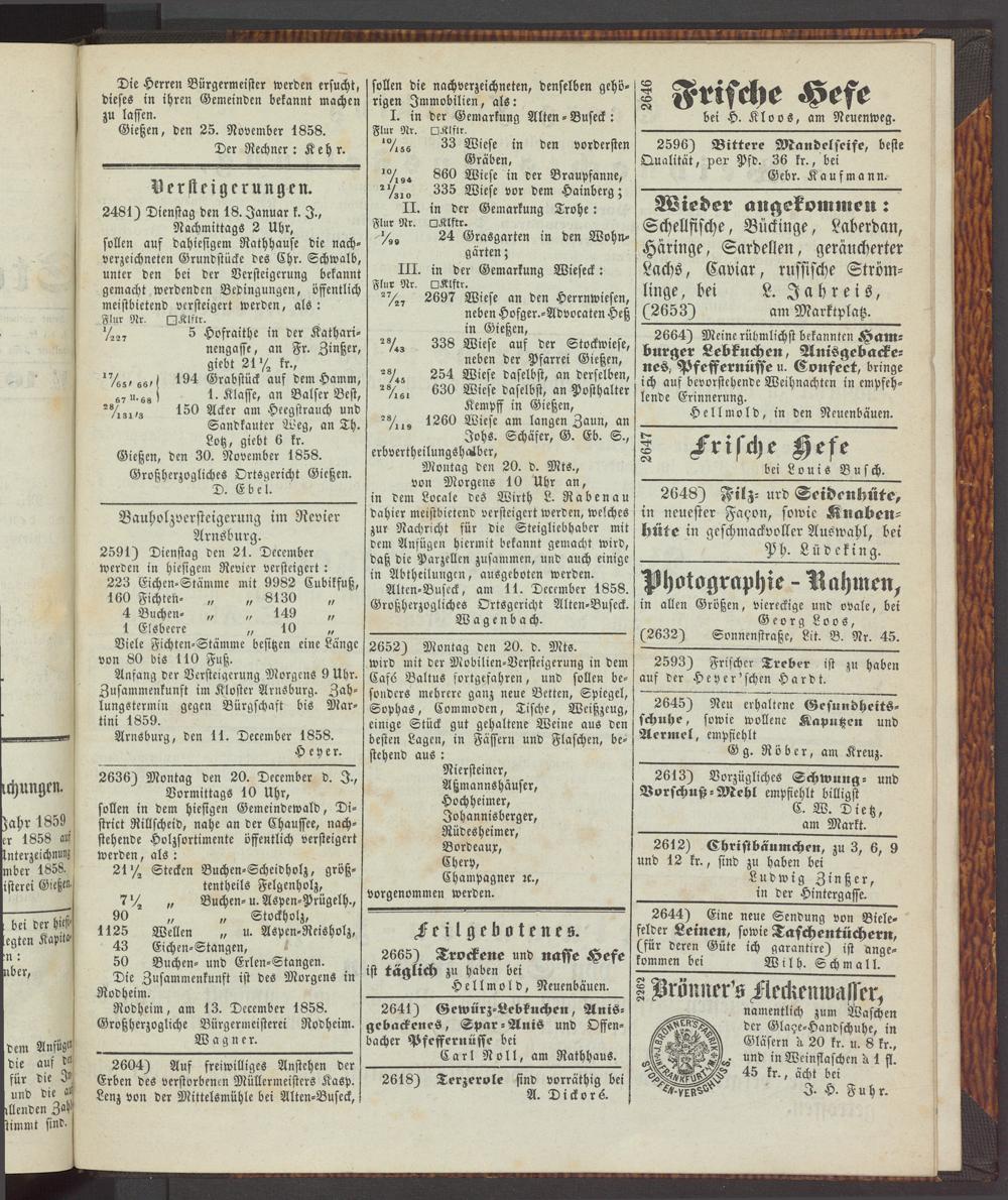 Gießen, den 30. November 1858. Großherzogliches Ortsqericht Gießen.