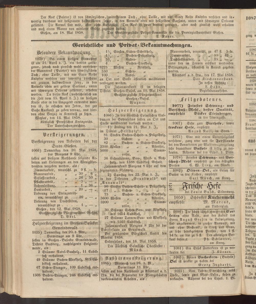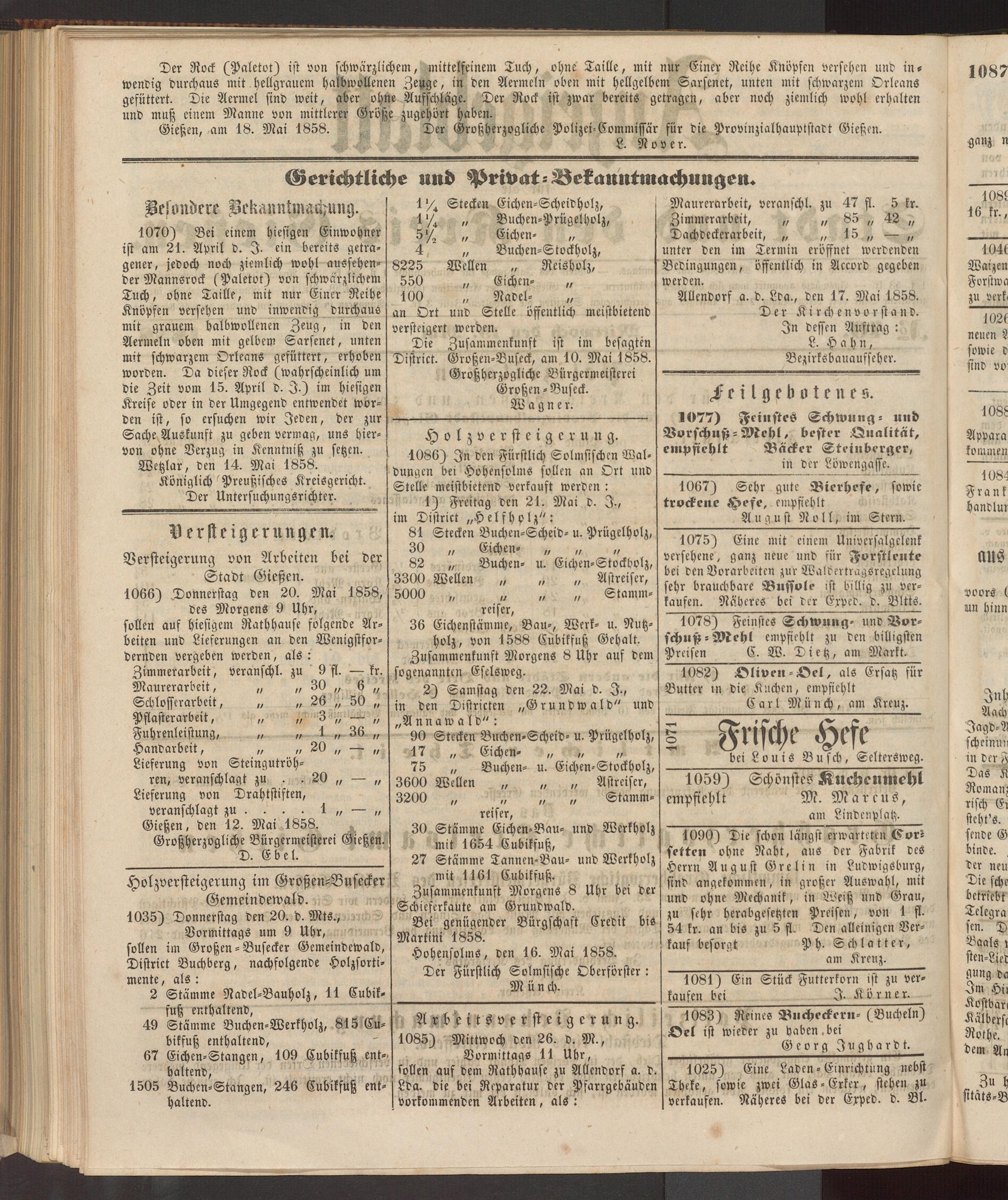 Gießen, am 18. Mai 1858. •• Der Grostherzogliche Polizei-Commissär für die Provinzialhauptstadt Gießen.