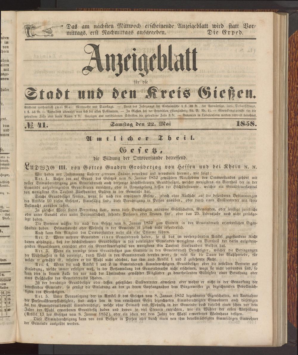 Erscheint wöchentlich zwei Mal: Mittwochs und Samstags. — Preis des Jahrgangs mr Einheimische 1 ff. 30 fr., für Auswärtige, itrcL Postatifschiags, 1 ff, 53 fr. — Auswärts abonnirt man stch bei allen Postämtern. — In Gießen bei der Erpedition (Canzleiberg Pit. B. Nr. 1). — EinxückungSgedühr für die gespaltene Zeile oder deren Raum 2 fr. Anzeigen aus verschiedenen Schriften die gespaltene Zeile 3 fr. — Annoncen in Tabellenform werden doppelt berechnet. jyo Samstag den 22. Mai l Se$S.