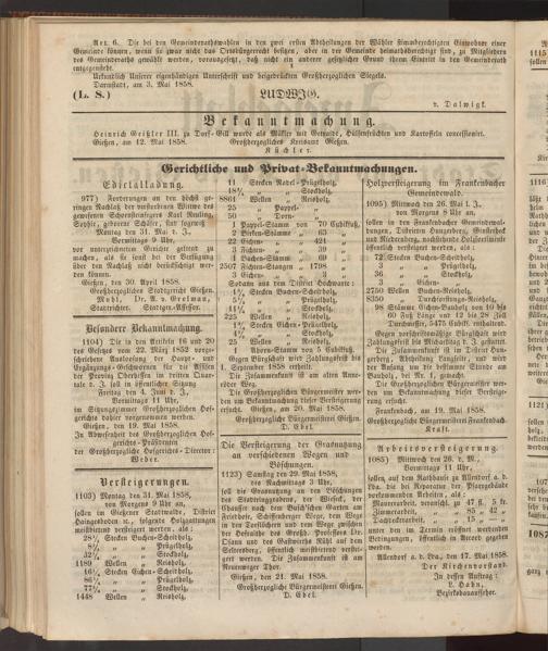 Die Großherzoglichen Bürgermeister werden um Bekanntmachung dieser Versteigerung ersucht. Gießen, am 20. Mai 1858.
