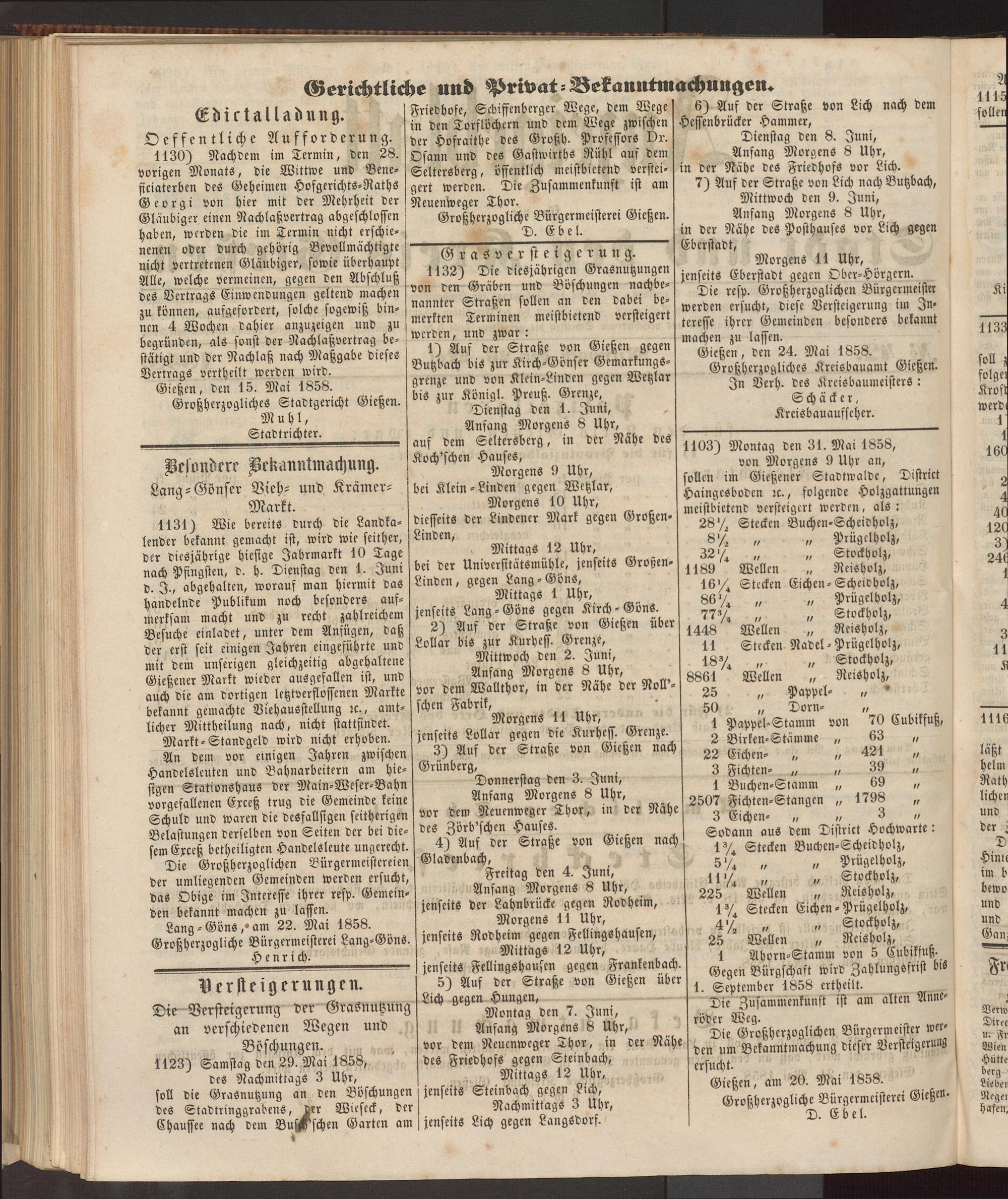 1123) Samstag den 29. Mai 1858, des Nachmittags 3 Uhr, soll die Grasnutzung an den Böschungen des Sladtringgrabcns, der Wieseck, der Chaussee nach dem BusHffchen Garten am