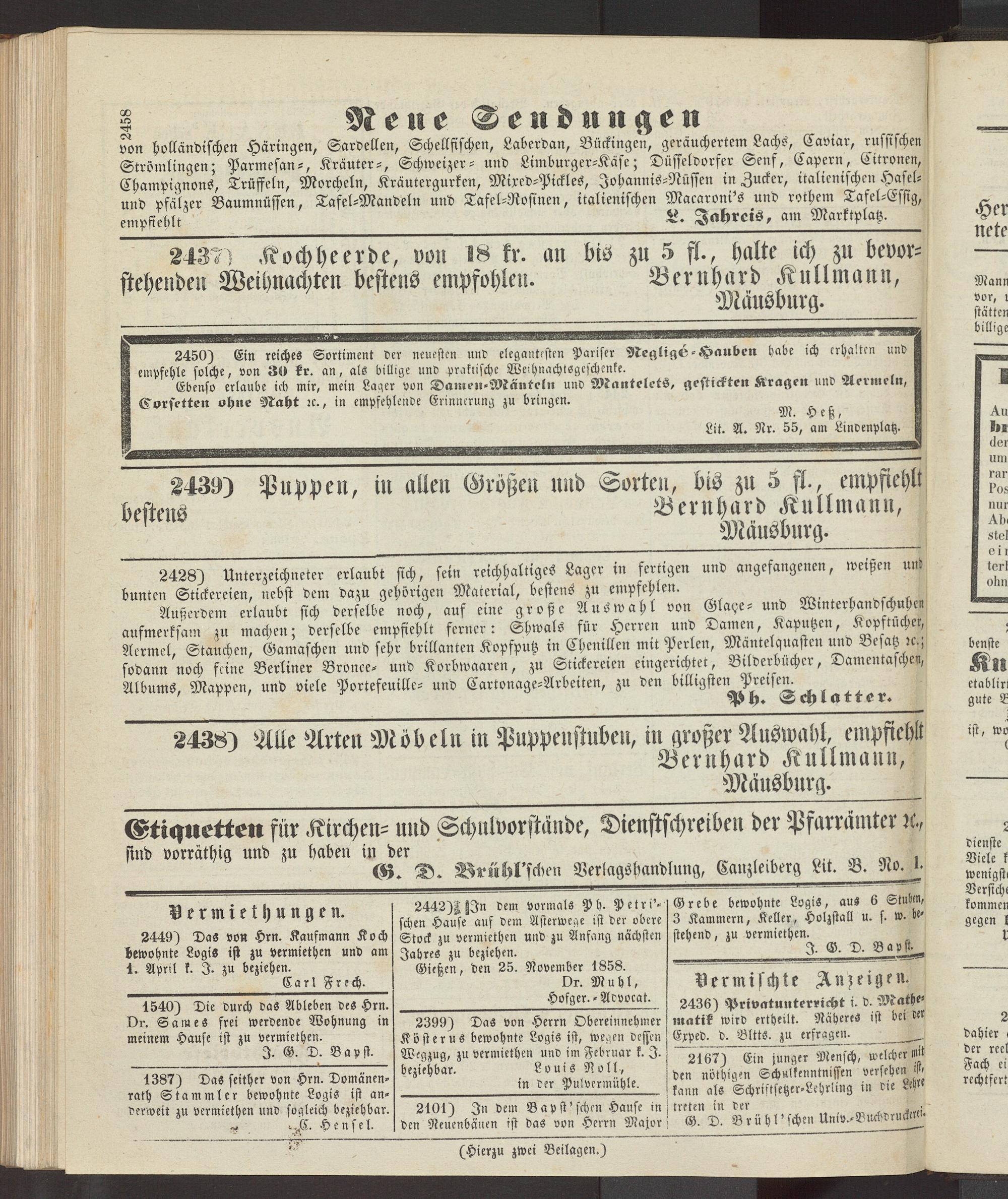 2437) Kochheerde, von iS fr. an bis zu 5 fl., halte ich zu bevorstehenden Weilmachten bestens empfohlen. Bernhard Kullmann,