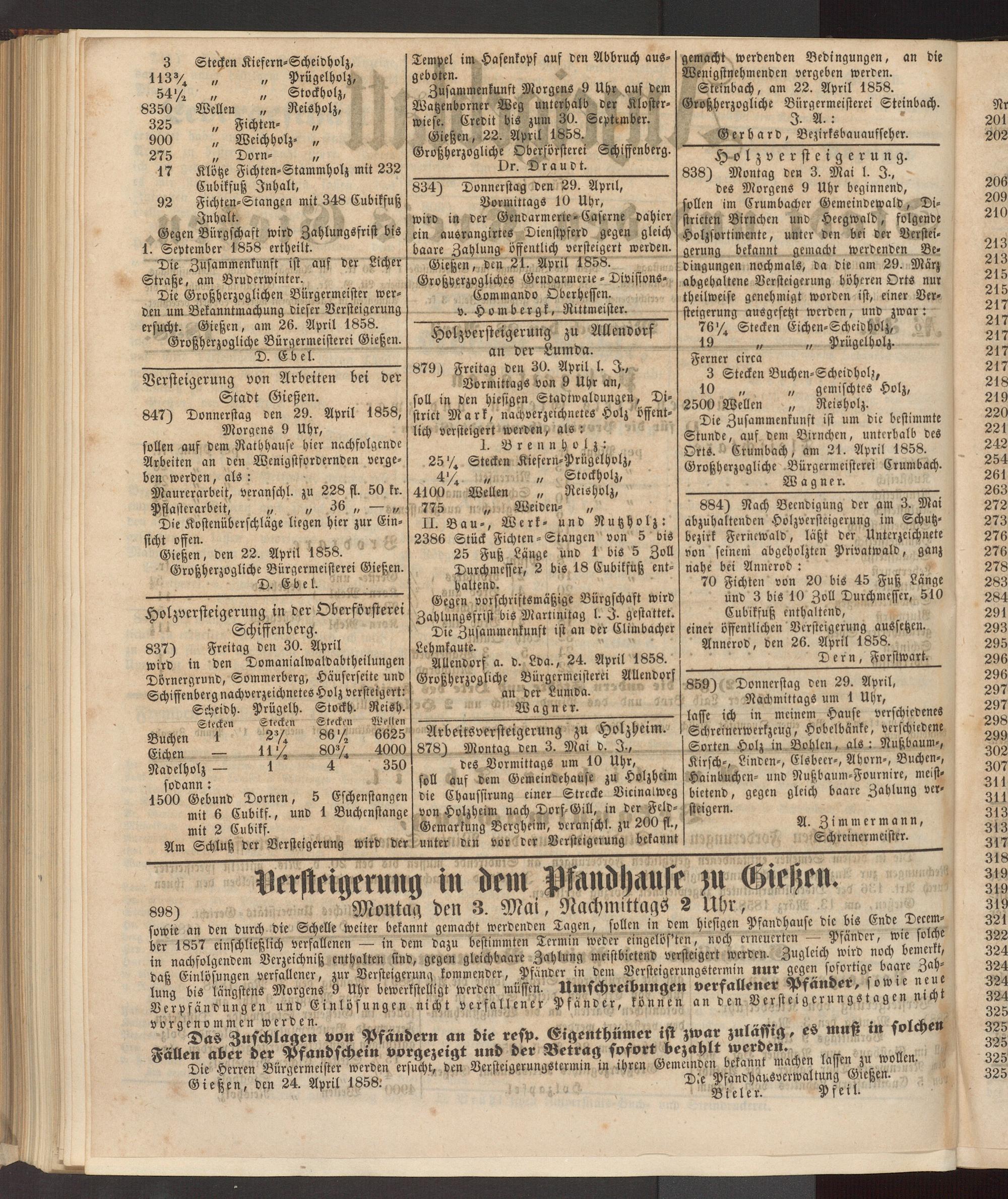 Die Großherzoglichen Bürgermeister werden um Bekanntmachung dieser Versteigerung ersucht. Gießen, am 26. April 1858.