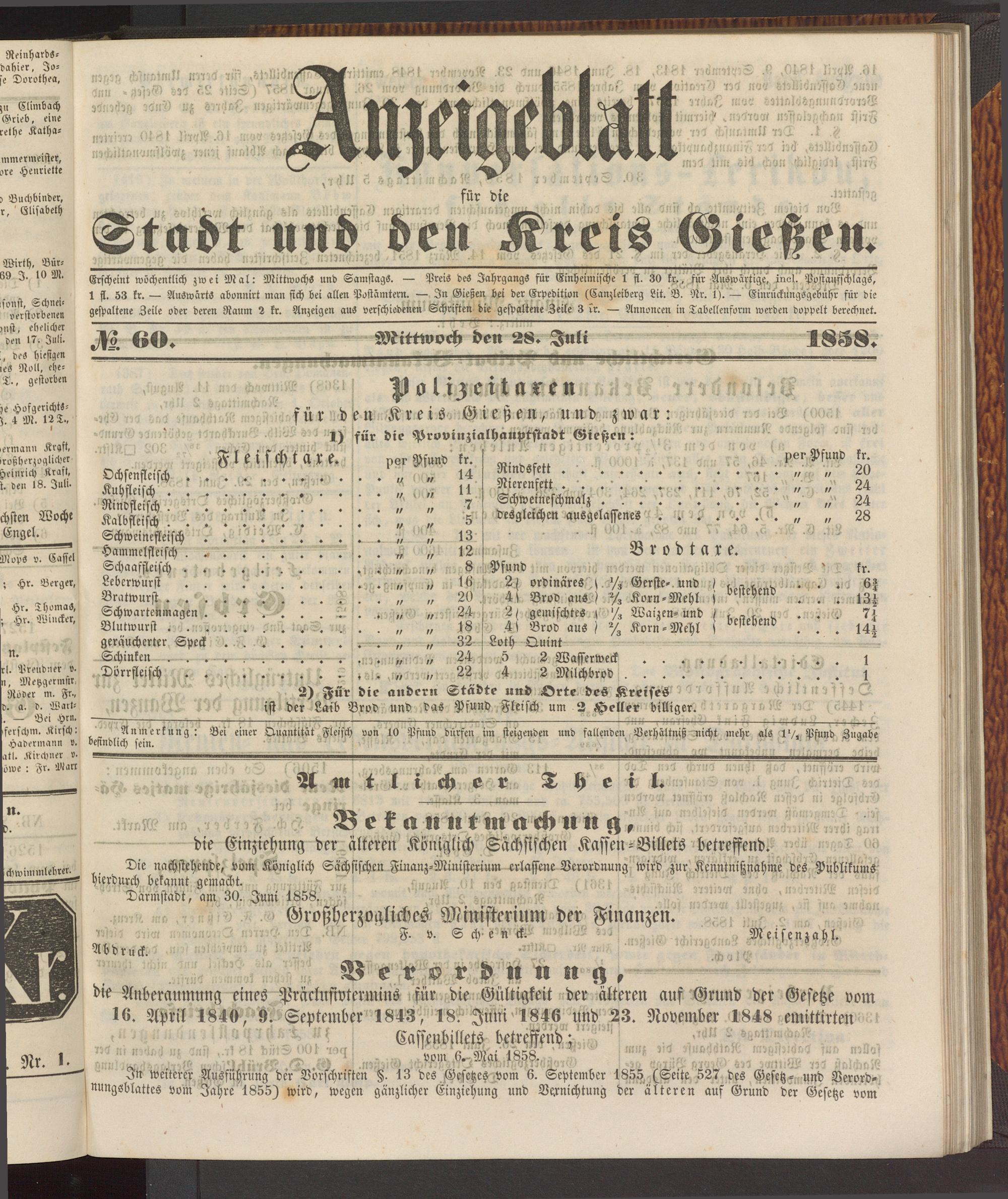 Erscheint wöchentlich zwei Mal: Mittwochs und Samstags. — Preis des Jahrgangs für Einheimische 1 st. 30 kr., für Auswärtige, inet Postaufschlags, 1 fl. 53 kr. — Auswärts abonnirt man fich bei allen Postämtern. — In Gießen bei der Erpedition (Canzleiberg Lit. B. Nr. 1). — Einrücknng'sgebühr für die gespaltene Zeile oder deren Raum 2 kr. Anzeigen aus verschiedenen Schriften die gespaltene Zeile 3 rr. — Annoncen in Tabellenform werden doppelt berechnet.
