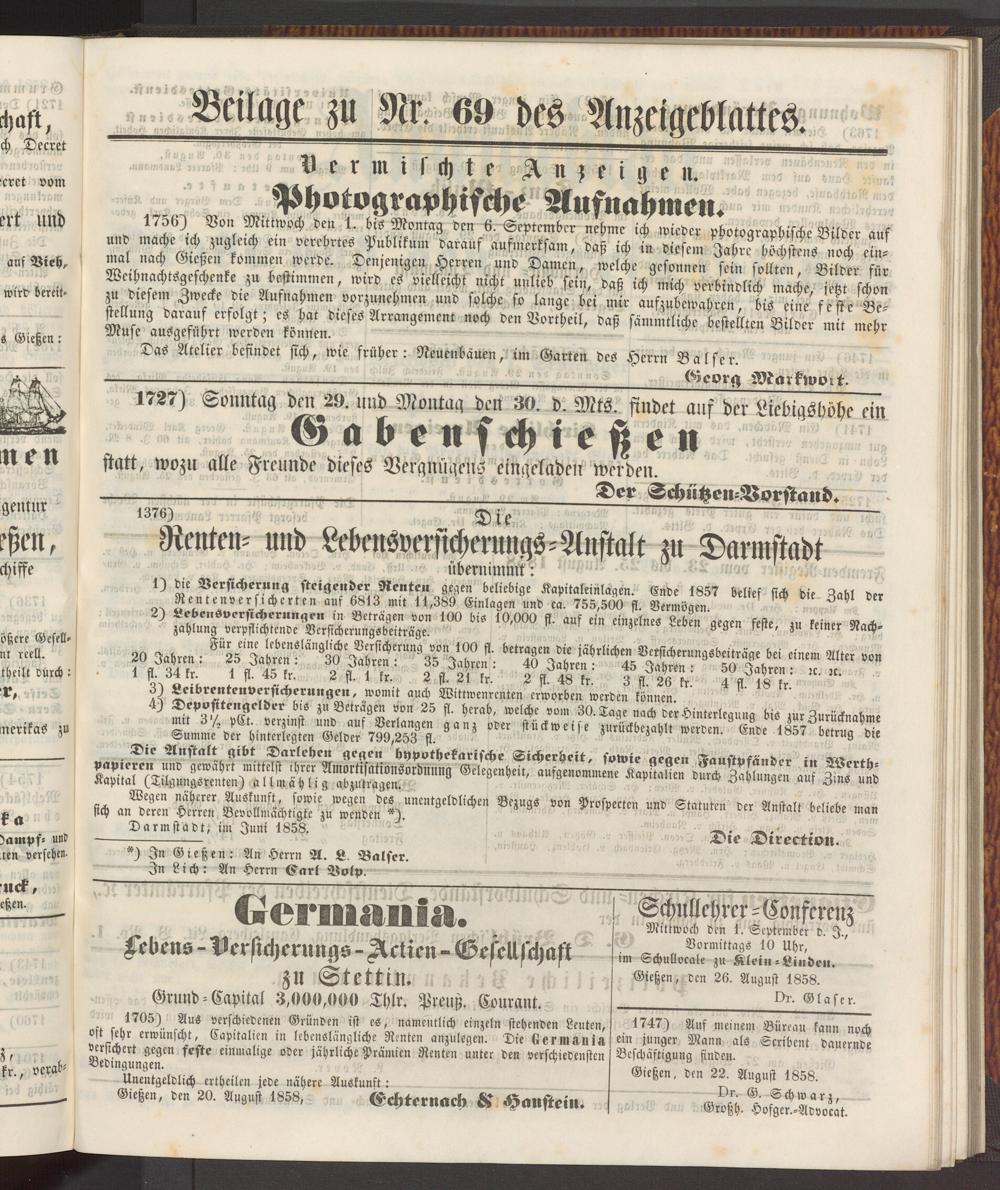 Vormittags 10 Uhr, im Schulloeale zu Klein-Linde». Gießen, den 26. August 1858.