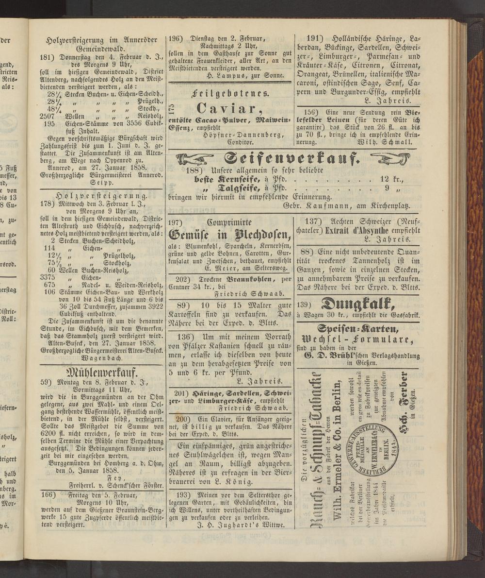191) Holländische Häringe, Laberdan, Bückinge, Sardellen, Schweizer-, Limburger-, Parmesan- und Kränter-Käse, Citronen, Citronat, Orangeat, Brünellen, italienische Ma- caroni, ostindischen Sago, Senf, Ca- pern und Burgunder-Esstg, empfiehlt __________________L. Iah reis.