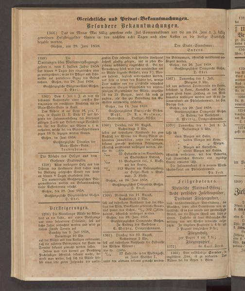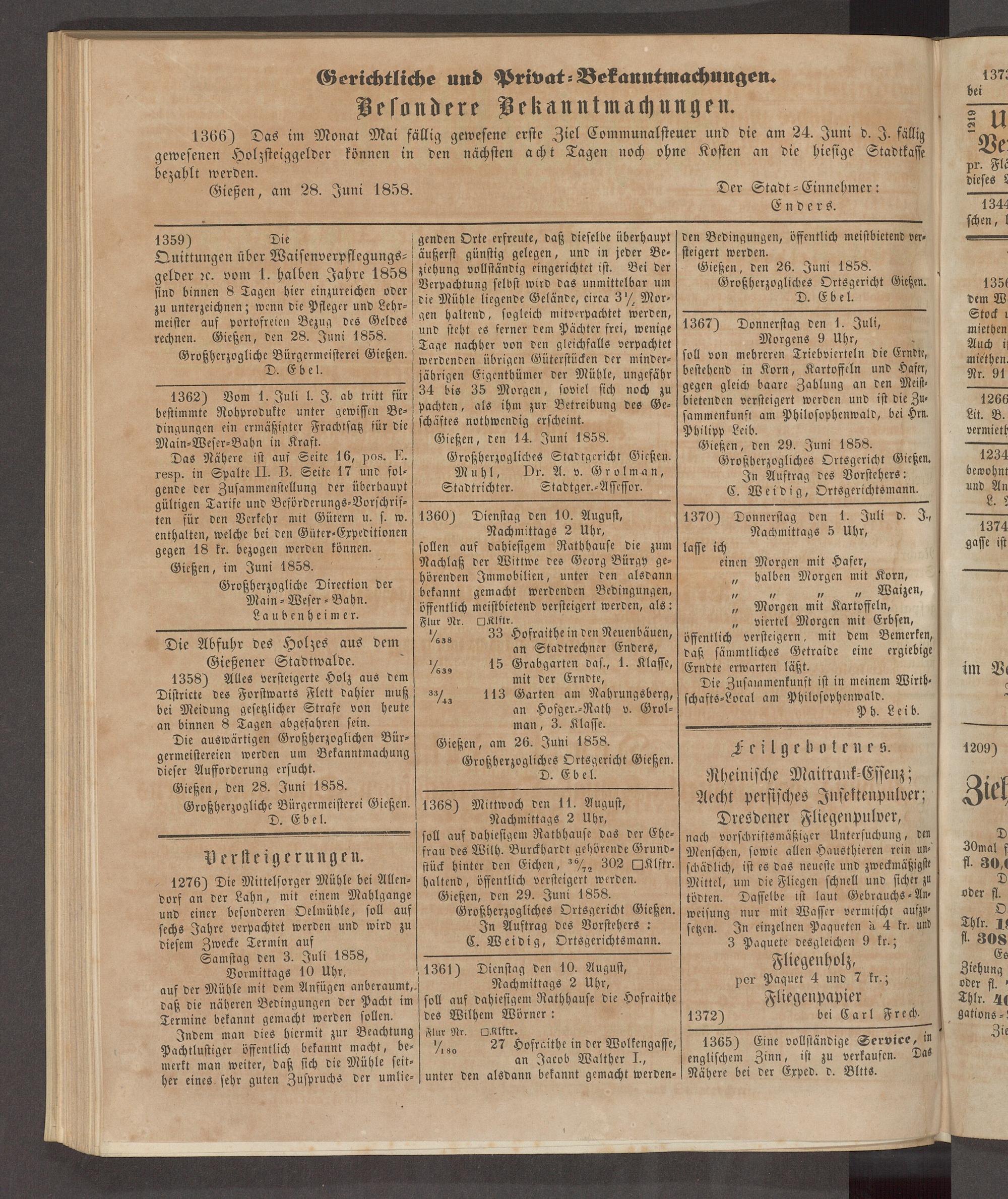Gießen, am 26. Juni 1858. Großherzogliches Ortsgericht Gießen. D. Ebel.