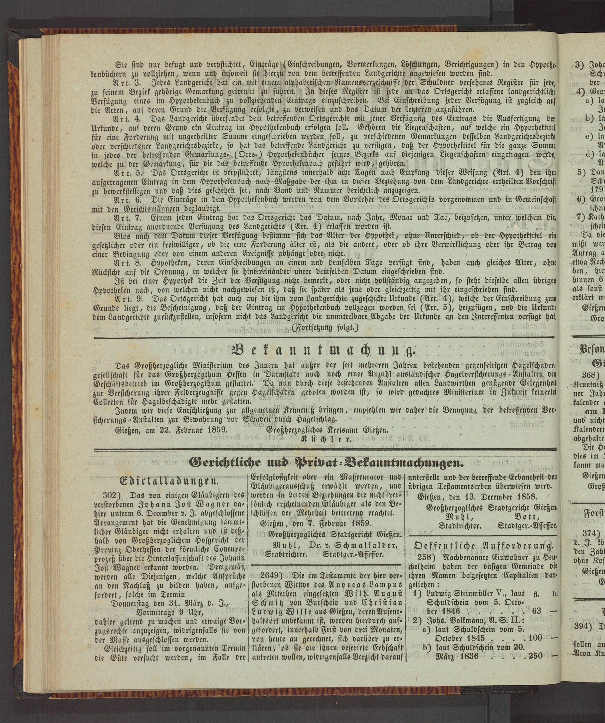 Gießen, am 22. Februar 1859. Großherzogliches Kreisamt Gießen.