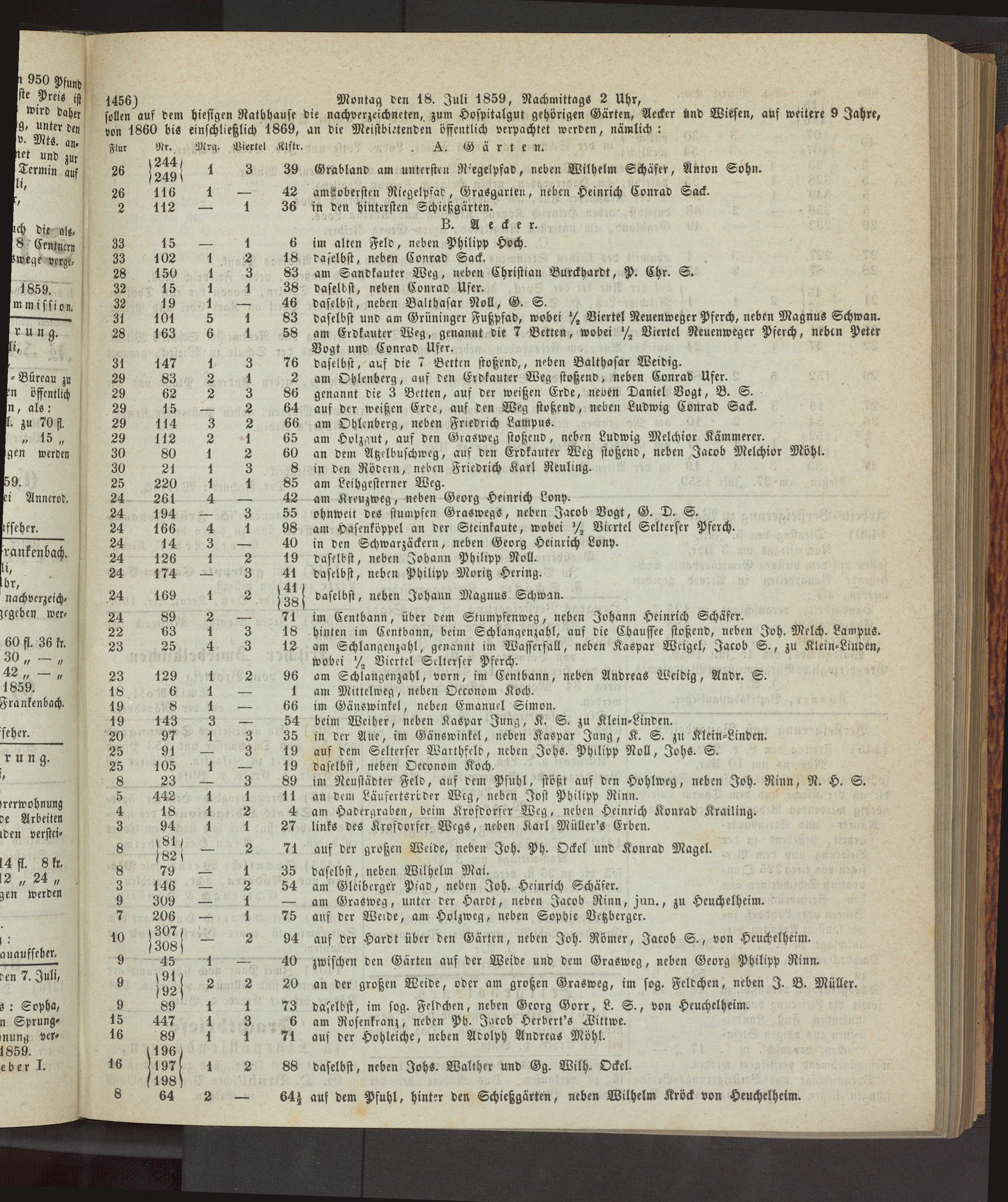 die nachverzeichneten, zum Hospitalgut gehörigen Gärten, Aeckcr und Wiesen, auf weitere 9 Jahre, an die Meistbietenden öffentlich verpachtet werden, nämlich: