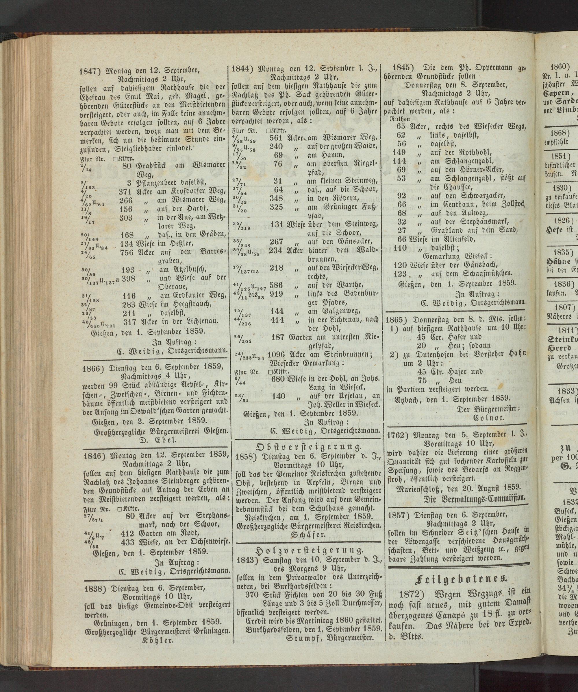 Reiskirchen, am 1. September 1859. Großherzogliche Bürgermeisterei Reiskirchen.
