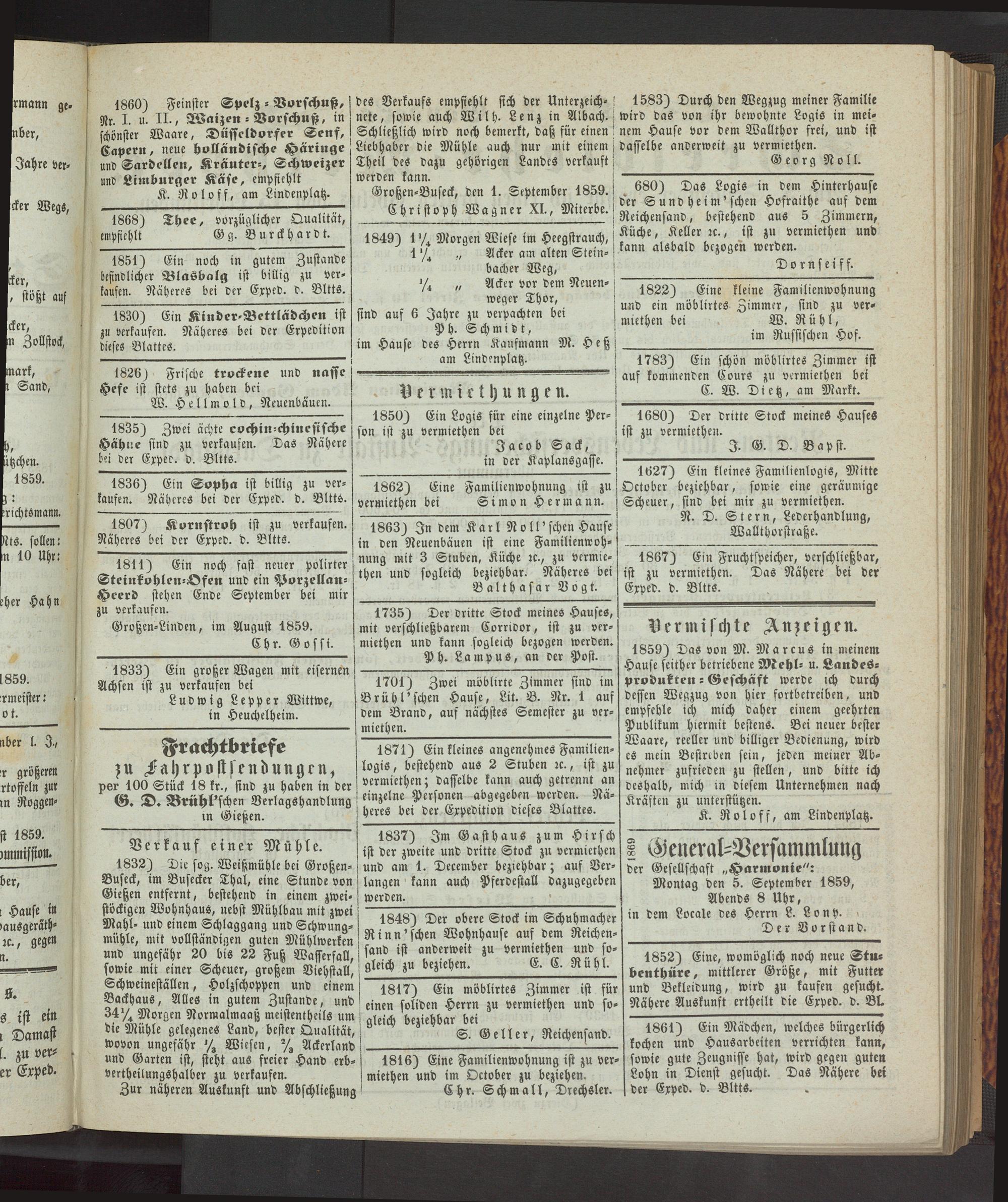 Montag den 5. September 1859, Abends 8 Uhr, in dem Locale des Herrn L. Lonp.