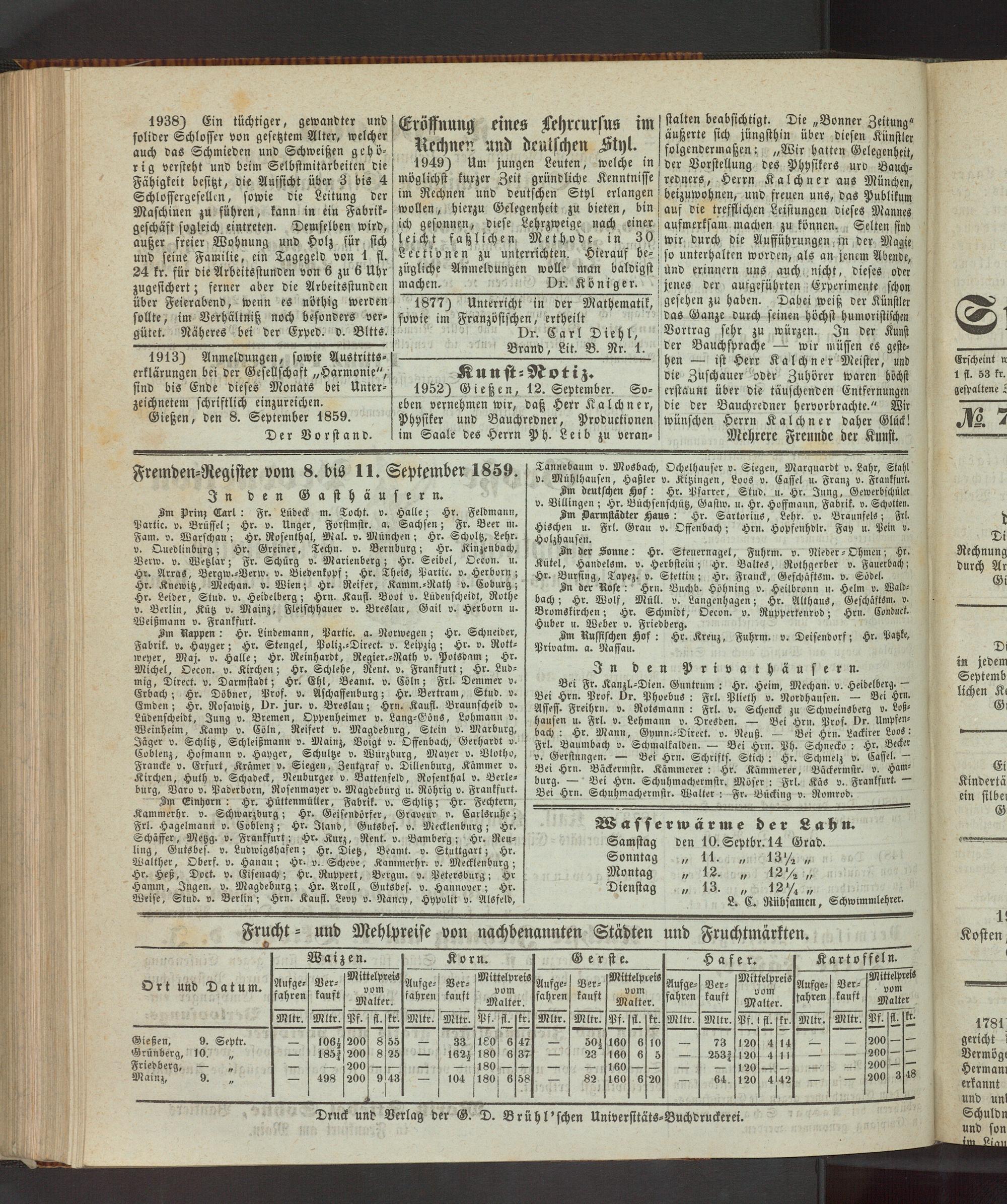 Fremden-Register vom 8. bis 11. September 1859.