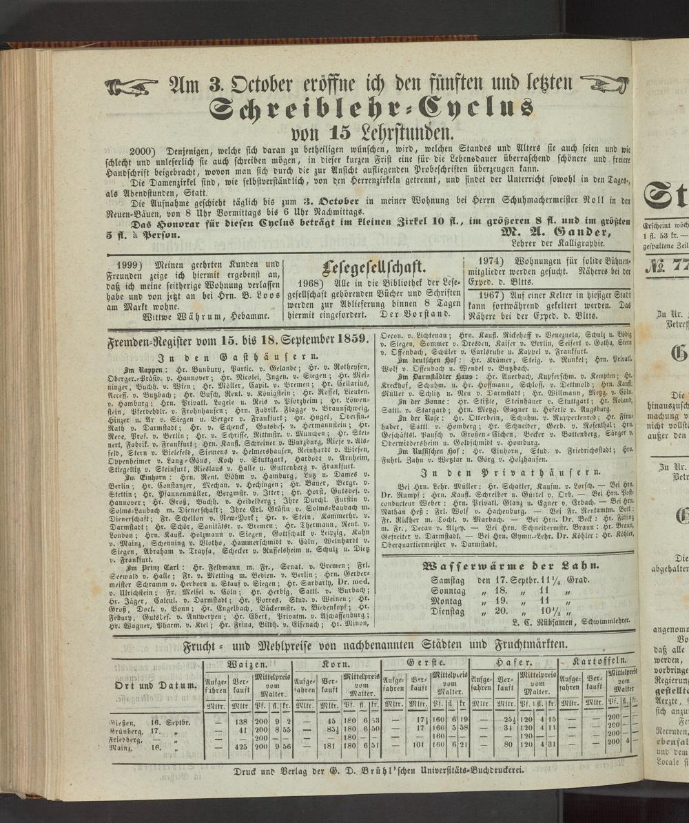 Im Prinz Carl: Hr. Feldmann m. Fr., Senat, v. Bremen; Frl. Seewald v. Halle; Fr. v. Metting m. Bedien, v. Berlin; Hrn. Gerbermeister Schramm v. Herborn u. Stauf v. Siegen; Hr. Sarbarly, Dr. med. v. Ulrichstein; Fr. Meisel v. Evln; Hr. Herbig, Satti, v. Bürbach; Hr. Jäger, Calcul. v. Darmstadt; Hr. Porres, Stud. v. Weinen ; Hr. Groß, Doct. v. Bonn; Hr. Engelbach, Bäckermstr. v. Biedenkopf; Hr. Febur'y, Gutsbes. v. Antwerpen-, Hr. Ebert, Prlvatm. v. Aschaffenburg; Hr. Wagner, Pharm. v. Kiel; Hr. Frina, Bildh. v. Eisenach; Hr. Minvn,