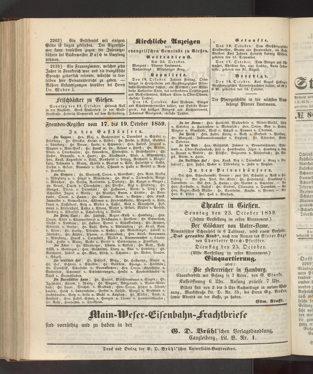 Im Prinz Carl: Hr. Zurbuch, Regier.-Rath v. Homburg; Hrn. Oecon. «stein v. Stumpertenrod u. Brückmann v. Florstadt; Hr. Schwellach, Buchb. v. Potsdam; Hr. Hübner, Secret, v. Aschaffenburg; Hr. Kramer, Referend. v. Berlin; Hr. Rühl, Verw. v. Philippstein; Hr. Kropf, Rent. v. Wien; Hr. Hurtig, Privatm. v. Cassel; Hr. Giedeldinger, Fabrik, v. Iserlohn; Hr. Kühler, Pharm. ».Gladenbach; Hrn. Kaust. Lampmaun v. Würzburg', Franck v. Darmstadt, Möller u. Simmermacher ». Lauterbach, Hecker v. Mainz, Rothe v. Berlin u. Sandermaun v. Frankfurt.