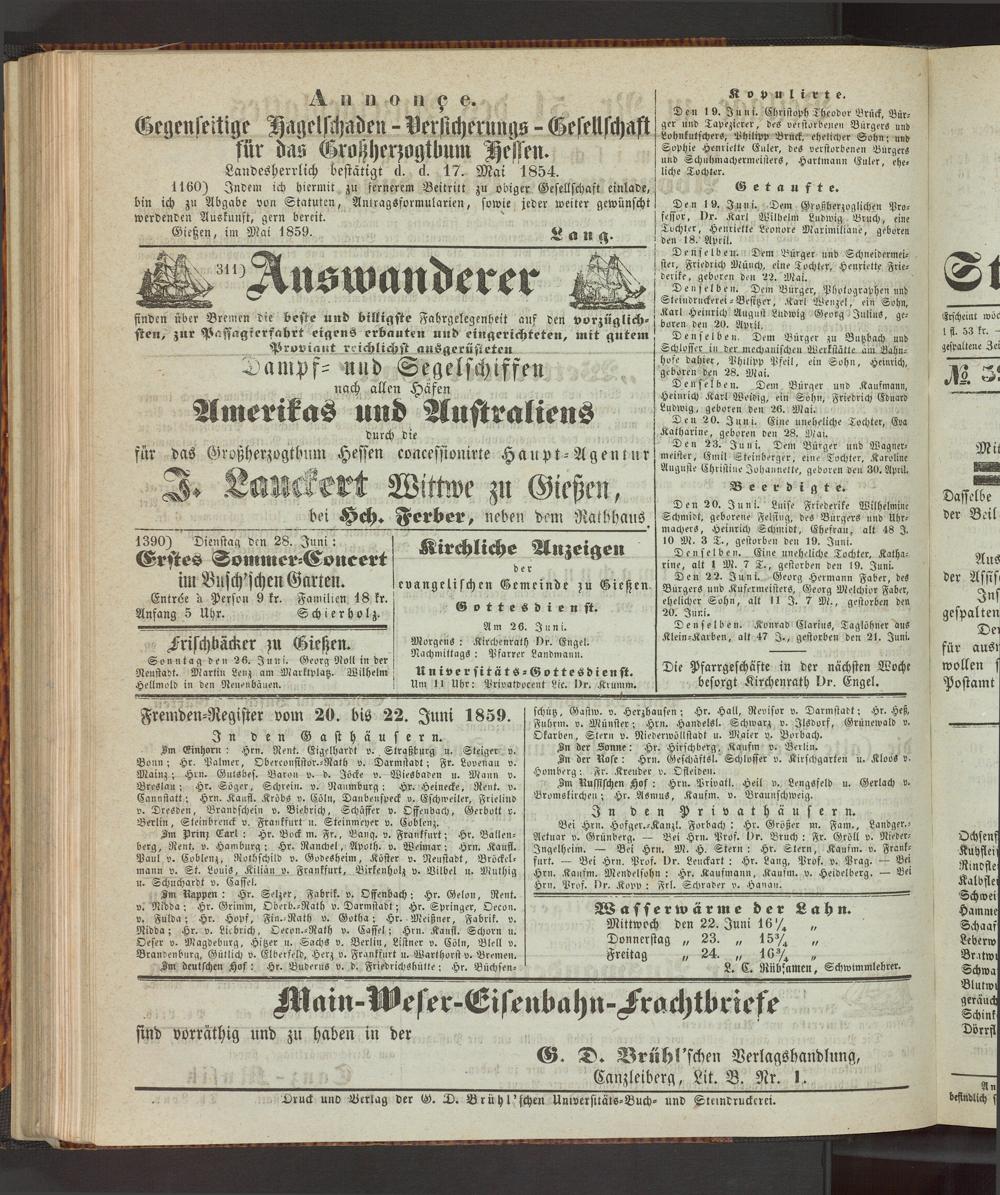 Fremden-Register vom 20. biß 22. Juni 1859.