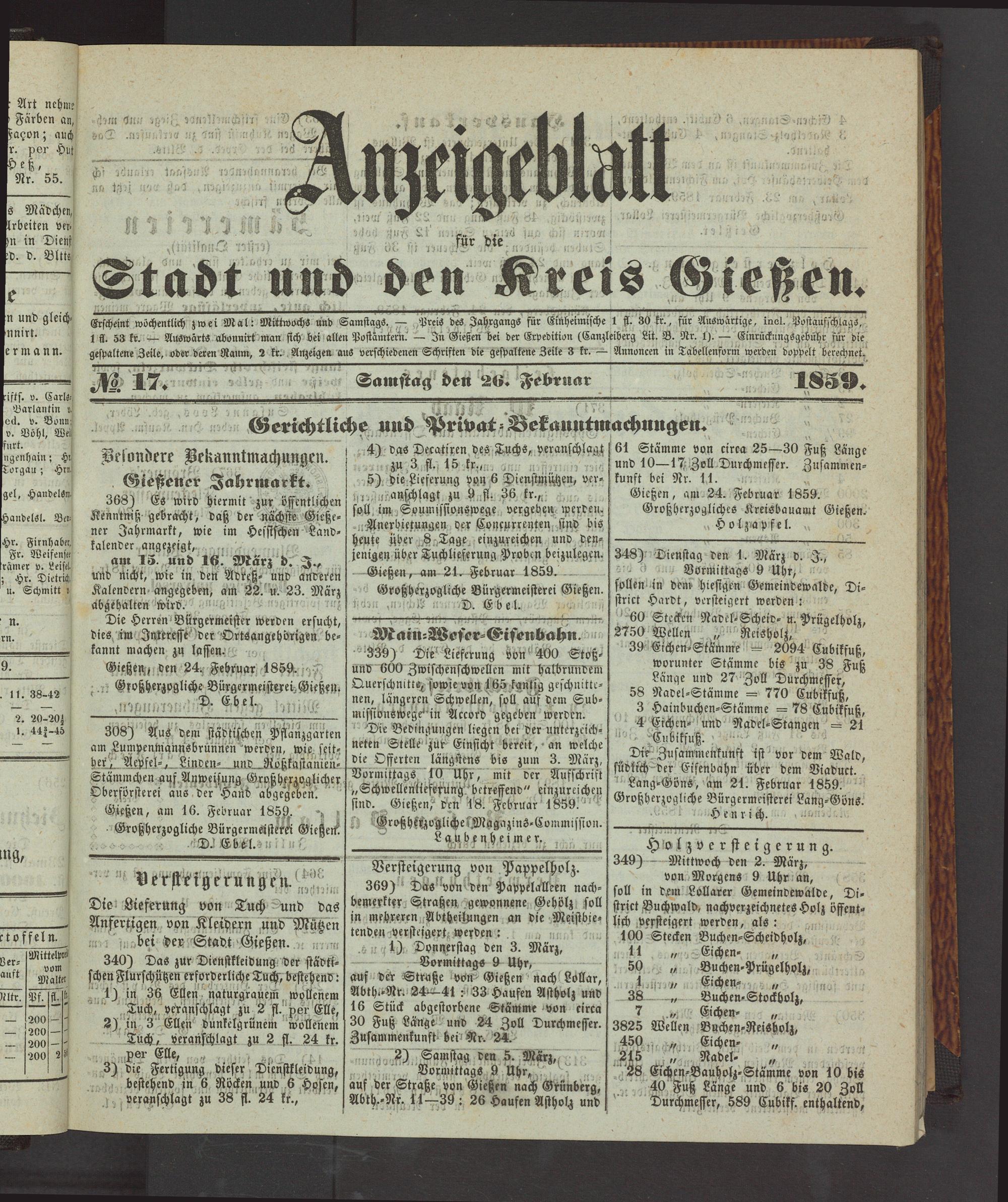 Erscheint wöchentlich zwei Mal: Mittwochs und Samstags. — Preis des Jahrgangs für Einheimische 1 ff. 30 ft., für Auswärtige, invl. Postaufschlags, 1 ff. 53 fr. — Auswärts abonnirt man sich bei allen Postämtern." — In Gießen bei der Expedition (Canzleiberg Lit. B. Nr. 1). — Einrücknngsgebühr für die gespaltene Zeile, oder deren Raum, 2 fr.. . Anzeigen aus verschiedenen Schriften die gespaltene Zeile 3 fr. — Annoncen in Täbellenform werden doppelt berechnet.