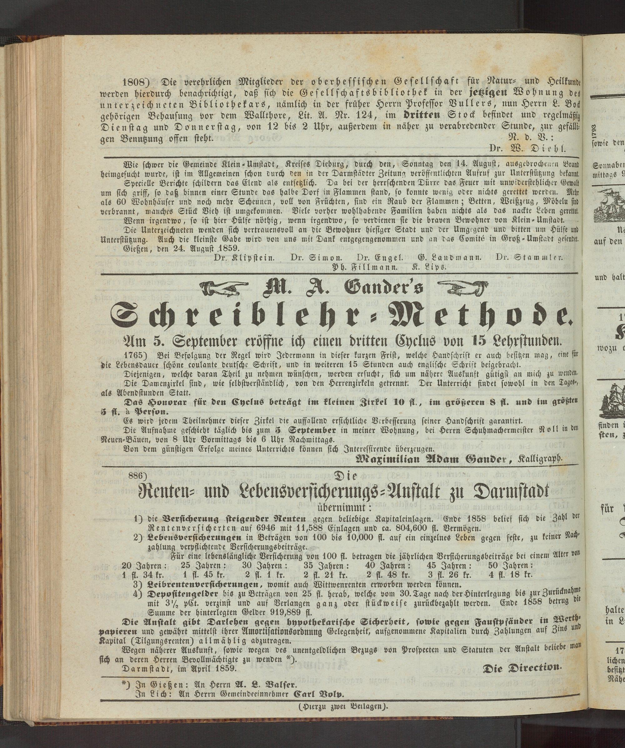 1808) Die verehrlichen Mitglieder der oberhessischen Gesellschaft für Niatur- und Heilkunde werden hierdurch benachrichtigt, daß sich die Gesellschaftsbibliothek in der jetzigen Wohnung bei unterzeichneten Bibliothekars, nämlich in der früher Herrn Professor Bullers, nun Herrn L. Boi gehörigen Behausung vor dem Wallthore, Lit. A. Nr. 124, im dritten Stock befindet und regelmäßig Dienstag und Donnerstag, von 12 bis 2 Uhr, außerdem in näher zu verabredender Stunde, zur gefälligen Benutzung offen steht. N. d. B.: