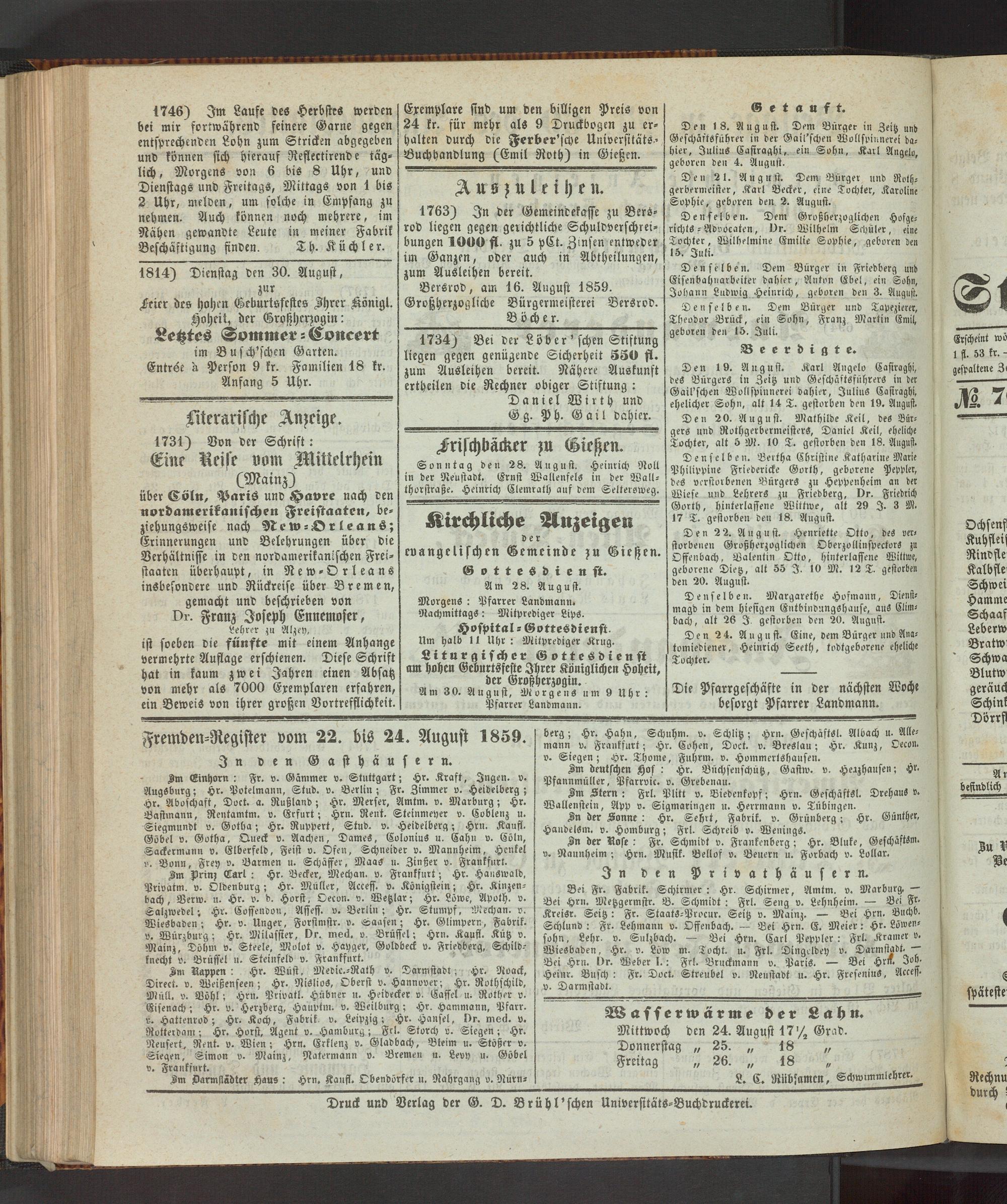 In der Rose: Fr. Schmidt v. Frankenberg; Hr. Bluke, Geschäftsm. v. Raunheim; Hrn. Musik. Bellof v. Beuern u. Forbach v. Lollar.