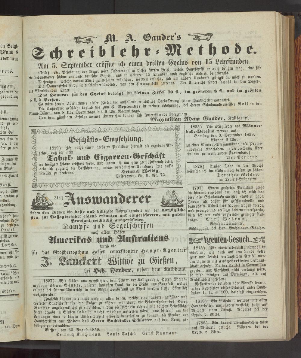 Zugleich können wir nicht umhin, allen denen, welche eine saubere, gefällige und, correcte Handschrift für die Folge zu führen wünschen, die Lehrmethode des Herrn Gand er angelegentlichst zu empfehlen, indem vielleicht ein Lehrer mit solchen Lehrfahig-; leiten begabt in Gießen sobald nicht wieder auftreten wird, und bitten, um die Leistungen einer so kurzen Unterrichtszeit gehörig beurtheilen zu können, die Proben der Handschriften am Lade» des Herrn Buchbinder Schlatter auf dem Kreuz ge-