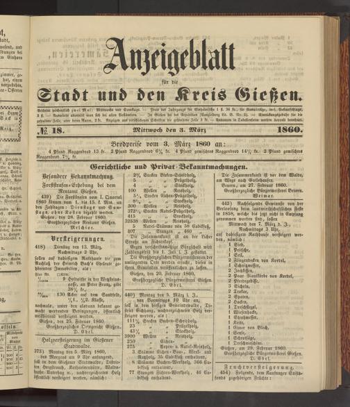 Erscheint wöchentlich zwei Mal: Mittwochs und Samstags. — Preis des Jahrgangs für Einheimische 1 fl. 36 kr., für Answärtige, incl. Postaufschlags, 2 ji, _ Auswärts abonnirt man sich bei allen Postämtern. — In Gießen bei der Expedition (Canzleiberg Lit. B. Nr. 1). Einrückungsgebühr für die gespaltene Zeile, oder deren Raum, 2kr. Anzeigen aus verschiedenen Schriften die gespaltene Zeile 3 kr. — Annoncen in Labellenform werden doppelt berechnet. M 18. Mittwoch den 3. März 1860.
