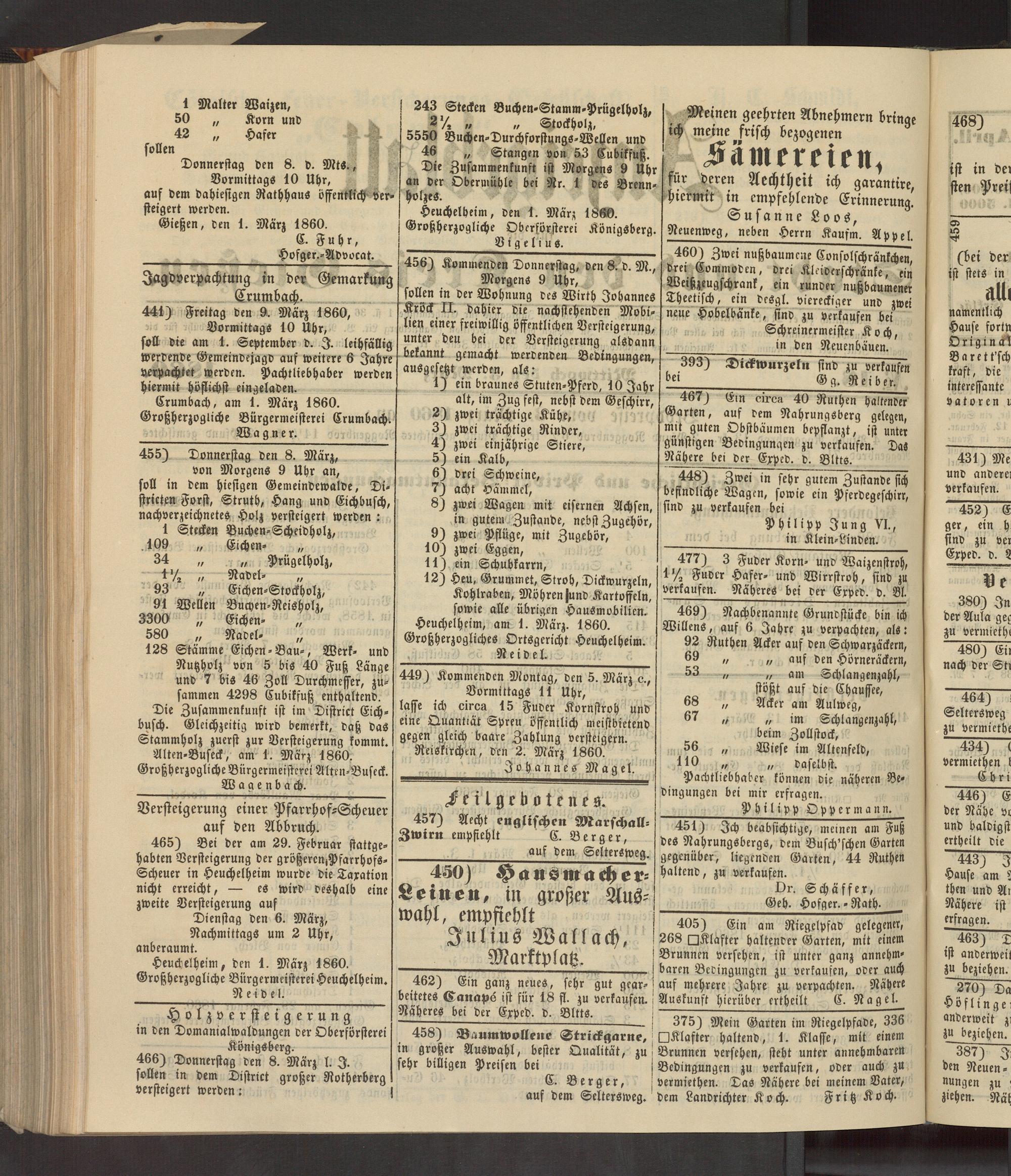 Heuchelheim, am 1. März. 1860. Großherzogliches Ortsgericht Heuchelheim. _____________Reidel.__ 449) Kommenden Montag, den 5. März c.,