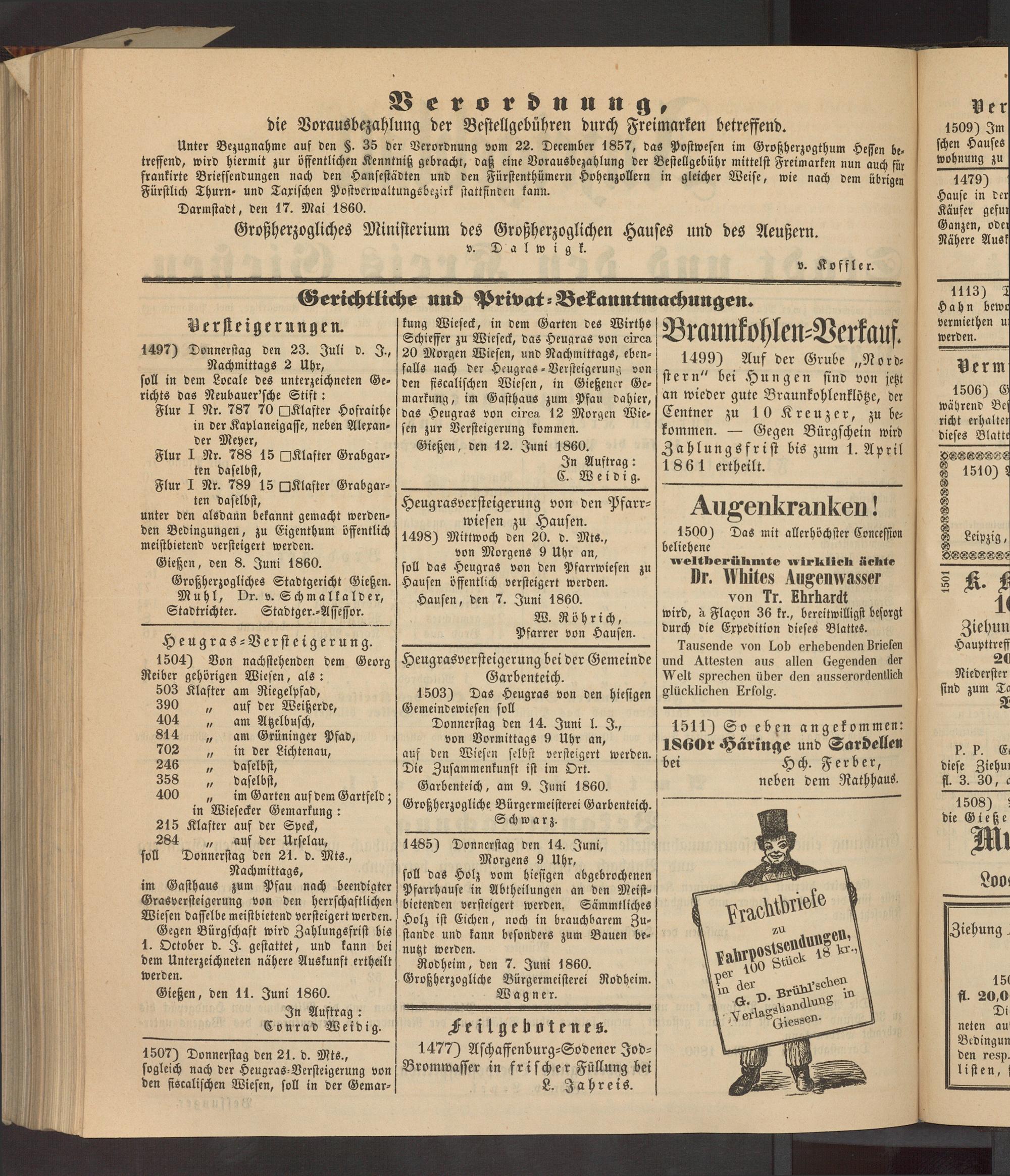 1499) Auf der Grube „Nordstern" bei Hungen sind von jetzt an wieder gute Braunkohlenklötze, der Gentner zu 1 0 K r e u z e r, zu bekommen. — Gegen Bürgschein wird Zahlungsfrist bis zum 1. April 18 61 ertheilt.