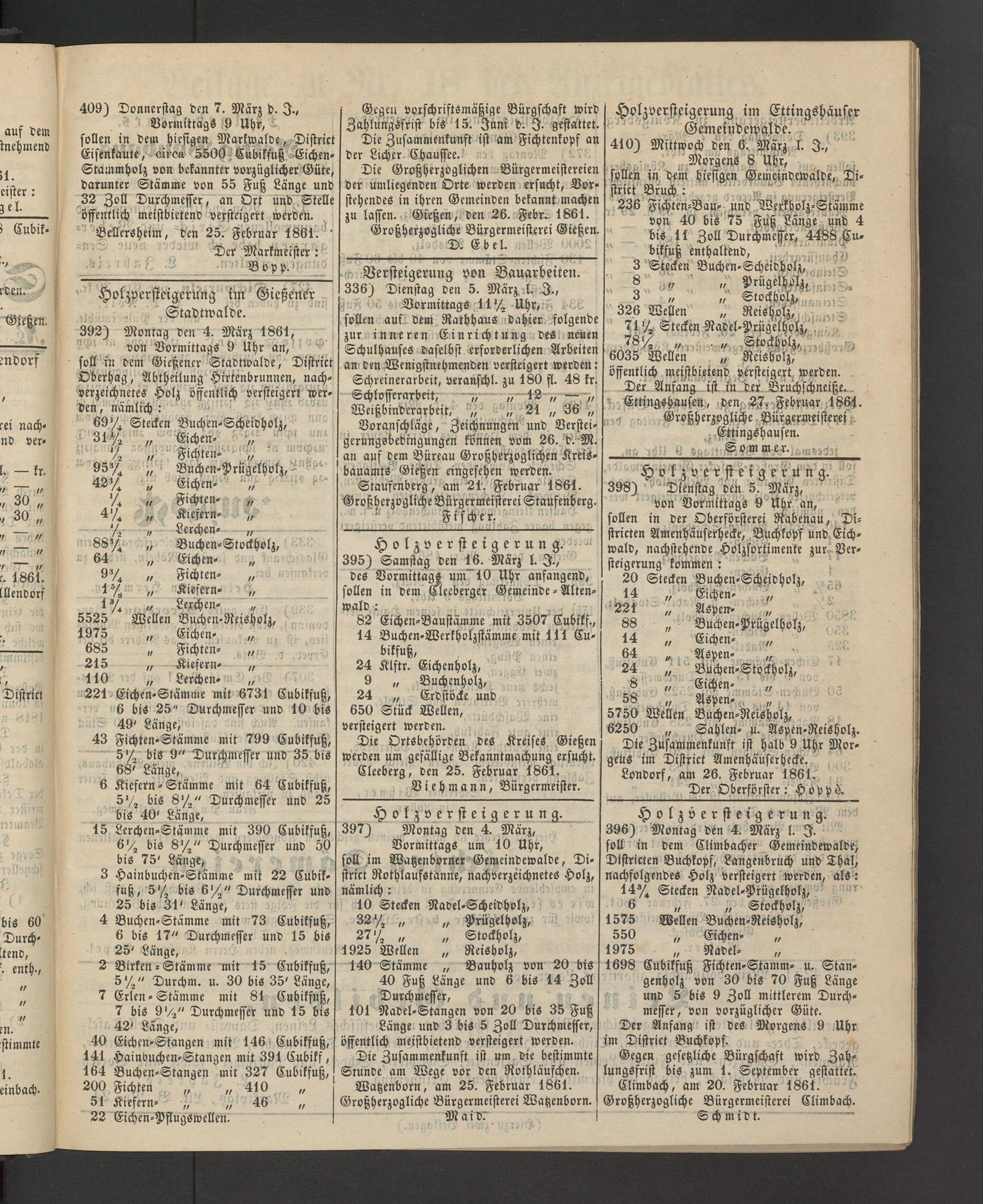 395) Samstag den 16. März l. I., des Vormittags um" 10 Uhr anfangend, sollen in dem Cleeberger Gemeinde - Altenwald :