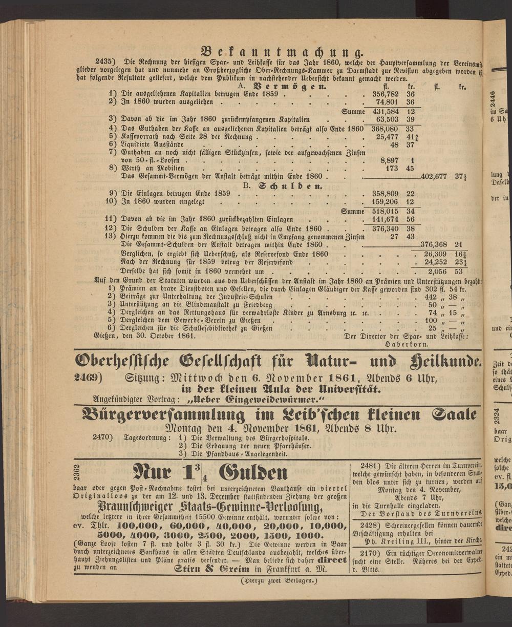 2435) Die Rechnung der hiesigen Spar- und Leihkasse für das Jahr 1860, welche der Hauptversammlung der Vereinsmis glieder Vorgelegen hat und nunmehr an Großberzogliche Ober-Rechnungs-Kammcr zu Darmstadt zur Revision abgegeben hat folgende Resultate geliefert, welche dem Publikum in nachstehender Ucbersicht bekannt gemacht werden.