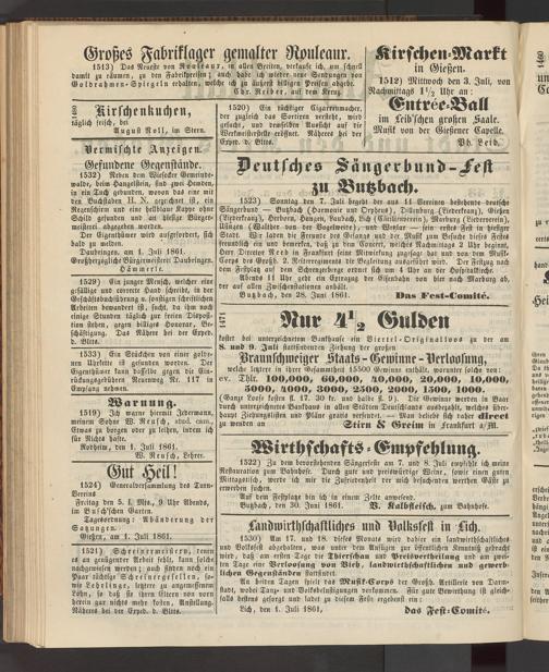 1523) Sonntag den 7. Juli begebt der aus 11 Vereinen bestehende deutsche Sängerbund — Butzbach (Harmonie und Orpheus), Dillenburg (Liederkranz), Gießen (Liederkranz), Herborn, Hungen, Laubach, Lich (Cäcilienverein), Marburg (Liederverein), Usingen (Walther von der Vogelweite), und Wetzlar — sein erstes Fest in hiesiger Stadt. Wir laden die Freunde des Gesangs und der Musik zum Besuche dieses Festes freundlich ein und bemerken, daß zu dem Concert, welches Nachmittags 2 Uhr beginnt, Herr Director Neeb in Frankfurt seine Mitwirkung zugesagi hat und von dem Musik- Corps des Großh. 2. Reiterregiments die Begleitung ausgefllhrt wird. Der Festzug nach dem Festplatz auf dem Schrenzerberge ordnet sich um 4 Uhr an der Hospitalkirche.