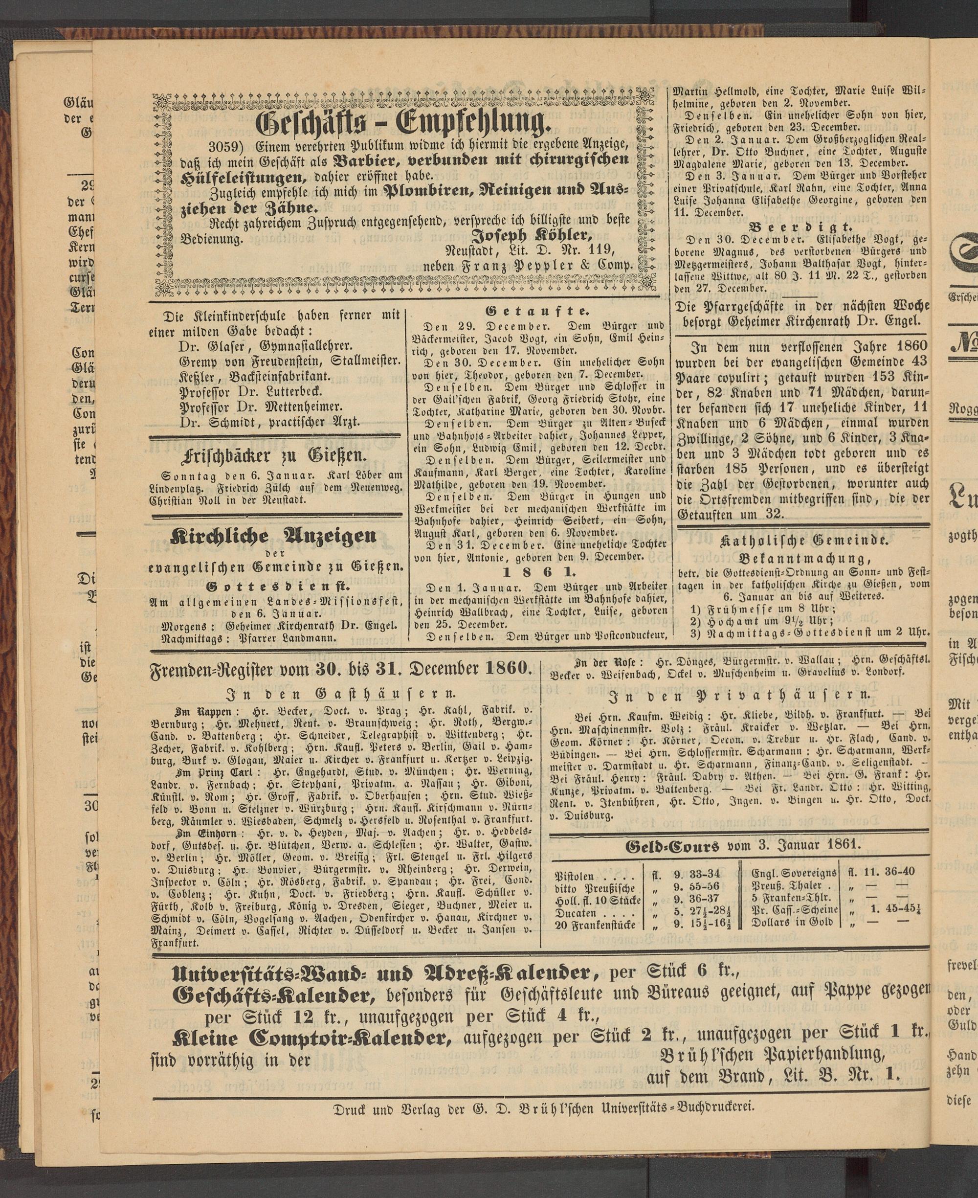 Geld-Cours vom 3. Januar 1861.