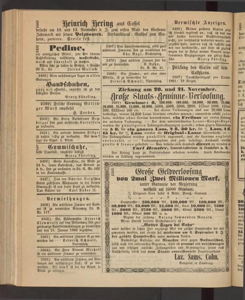 2505) Bei Bäckermeister Heinrich C l e m m r a t h auf dem Seltersweg sind zwei geräumige Familienwohnungen zu vermiethen und den 21. Januar 1862 beziehbar.