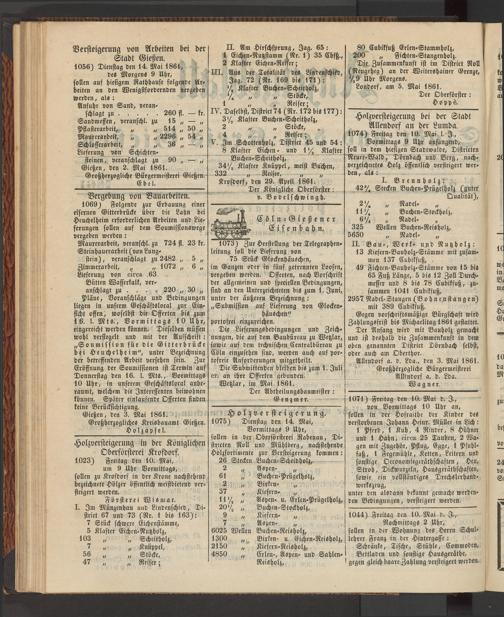 1023) Freitag den 10. Mai, um 9 Uhr Vormittags, sollen zu Krofdorf in der Krone nachstehend bezeichnete Hölzer öffentlich meistbietend versteigert werden.