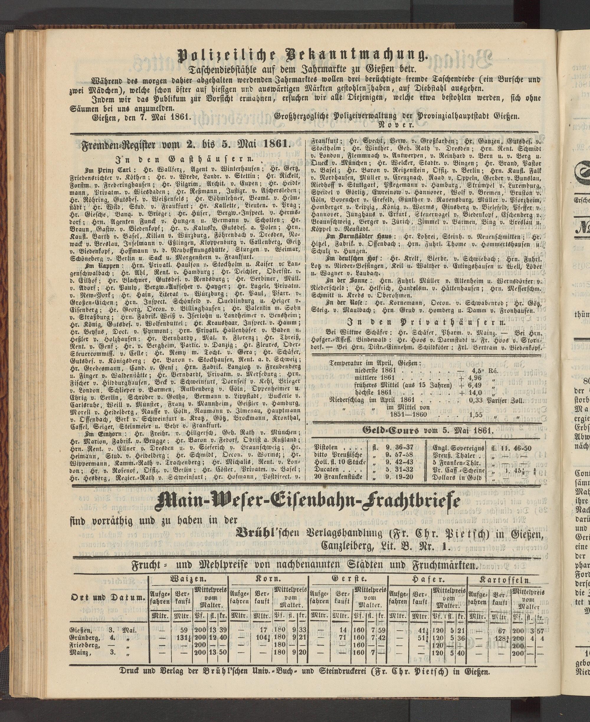 Gießen, den 7. Mai 1861. Großherzogliche Polizeiverwaltung der Provinzialhauptstadt Gießen.