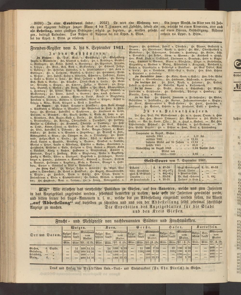In der Rose : Hr. Schmidt, Zimnierm. v. Frohnhausen; Hr. Bieber, Geschäfts«», v. Feldkrücken; Hr. Greiner, Instrumentenmacher v. Wetzlar; Hr. Niers, Weichenwärter v. Groß-Karben; Hr. Hardt, Handelsm. v. Hattenrod; Hr. Seibert, Schrein, u. Hr. Firnhaber, Satti, v Homberg.
