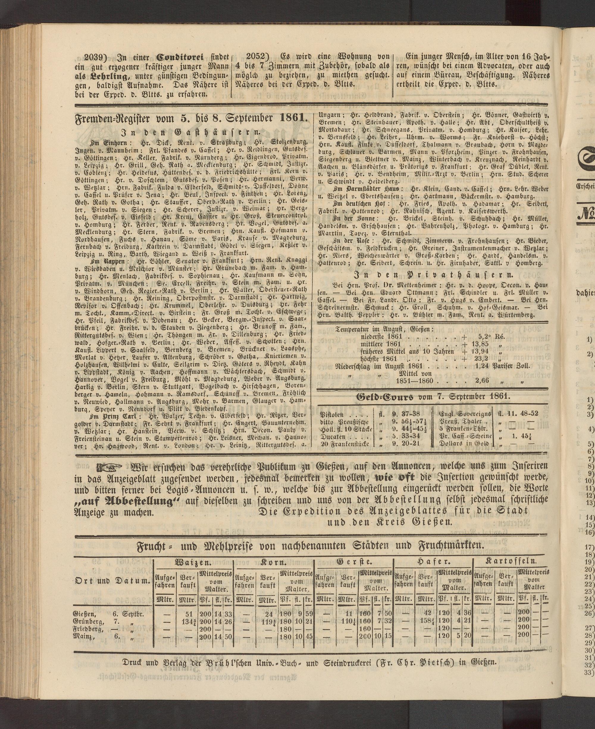 Im Darmstädter Haus : Hr. Klein, Cand. v. Eaffel; Hrn. Lehr. Weber u. Weitzel v. Eberlshansen; Hr. Hartmann, Bäckermstr. v. Hamburg.