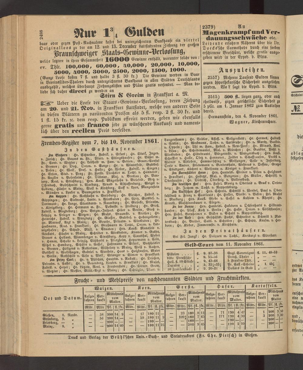Im Prinz Carl : Hr. v. Möschen, Hauptm. v. Rastatt; Hr. Drießen, Privatm. v. Cassel; Hr. v. Bouenberg, Stenten, v. Frankfurt; Hr. Muiot, Fabrik, v. Hayer; Hr. Lützow, Reist, v. Freudenstadt; Hr. Steuer Geom. v. Wetzlar; Hr. Nießler, Milit.-Arzt v. Mainz; Hr. Schrögler, Pfarr. o.