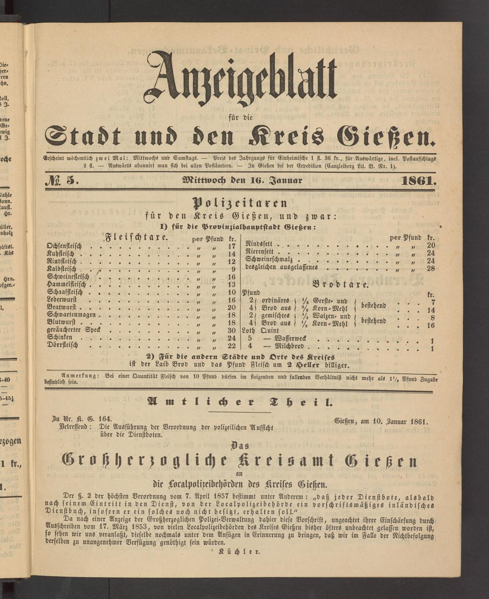 Erscheint wöchentlich zwei Mal: Mittwochs und Samstags. — Preis des Jahrgangs für Einheimische 1 ff. 36 fr., für Auswärtige, incl. Postaufschlags 2 st. — Auswärts abonnirt man fich bei allen Postämtern. — In Gießen bei der Erpedition (Canzleiberg Lit. B. Nr. 1).