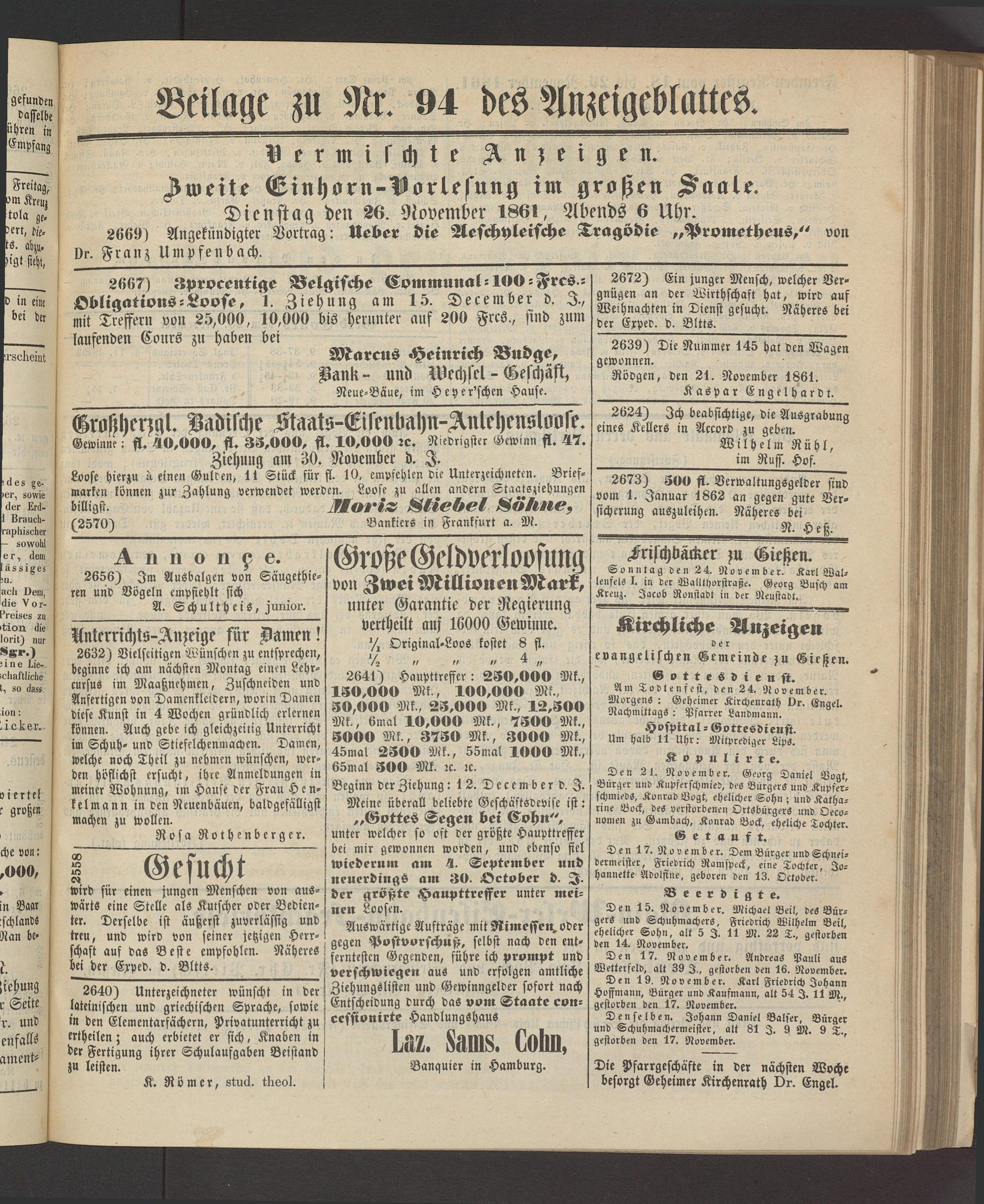 Dienftag dm 26. 9!ovember 1861, Abends 6 Uhr.